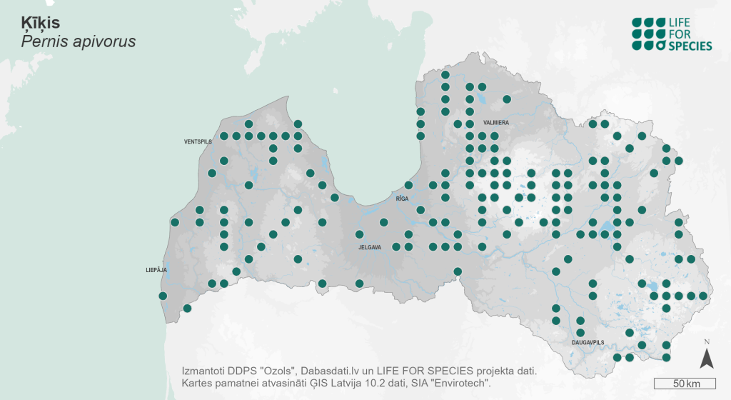Summary. European Honey-buzzard − Pernis apivorus. In Latvia, the distribution has not changed significantly since the 1980s, however, it should be considered that the incomplete detection of the species could have occurred due to its late breeding season. The AOO of breeding population is 848 km2, the EOO – 75,073 km2. The breeding population is estimated at 1,063–7,203 pairs (2,126–14,406 adult individuals). The population is increasing in the long term, while the short-term trend of the population is unclear. However, a 79% drop in population is projected if the current population change is extrapolated over three generations. The breeding habitat includes a variety of forests interspersed with fields, grasslands and wetlands. Many birds are shot during migration. The habitat is negatively affected by forestry activities. Disturbances during the breeding period also threaten the species. Wind farm development can have significant negative impacts. Monitoring of the breeding population is ongoing. The possibility of creating micro-reserves needs to be provided to conserve the habitats of the species. Conservation of breeding habitats and the elimination of disturbances during the breeding season are required for the protection of the species.