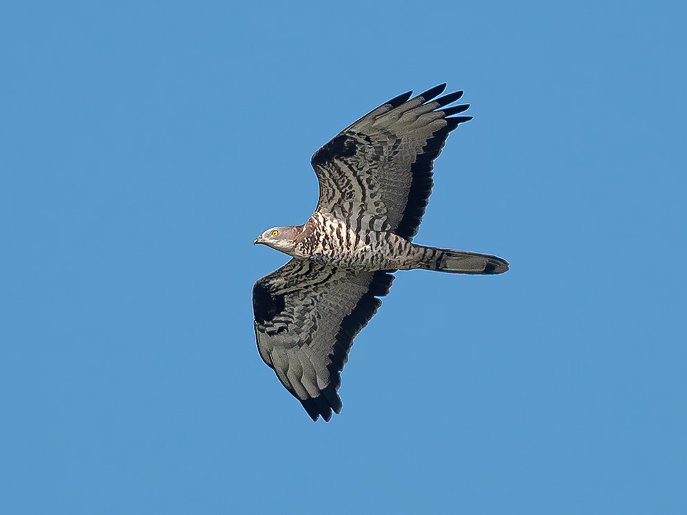 Morfoloģija un bioloģija. Kraukļa lieluma plēsējputns ar slaidiem spārniem un garu asti. Apspalvojuma pamatkrāsa ļoti dažāda – sastopami gan ļoti gaiši, gan tumši īpatņi. Uz astes divas šauras tumšas svītras un tās galā viena platāka. Tēviņam galva pelnpelēka, mātītei tumšbrūna. Pārtiek galvenokārt no plēvspārņiem – lapsenēm, savvaļas bitēm, kamenēm u. tml. Ligzdu būvē dažādu sugu kokos, labprātāk eglēs. Ligzdu parasti izmanto tikai vienu gadu. Dējumā 1–3 olas, gadā viens perējums. Mazuļi ligzdguļi. Gājputns, ziemo Āfrikā (LOB 2002).