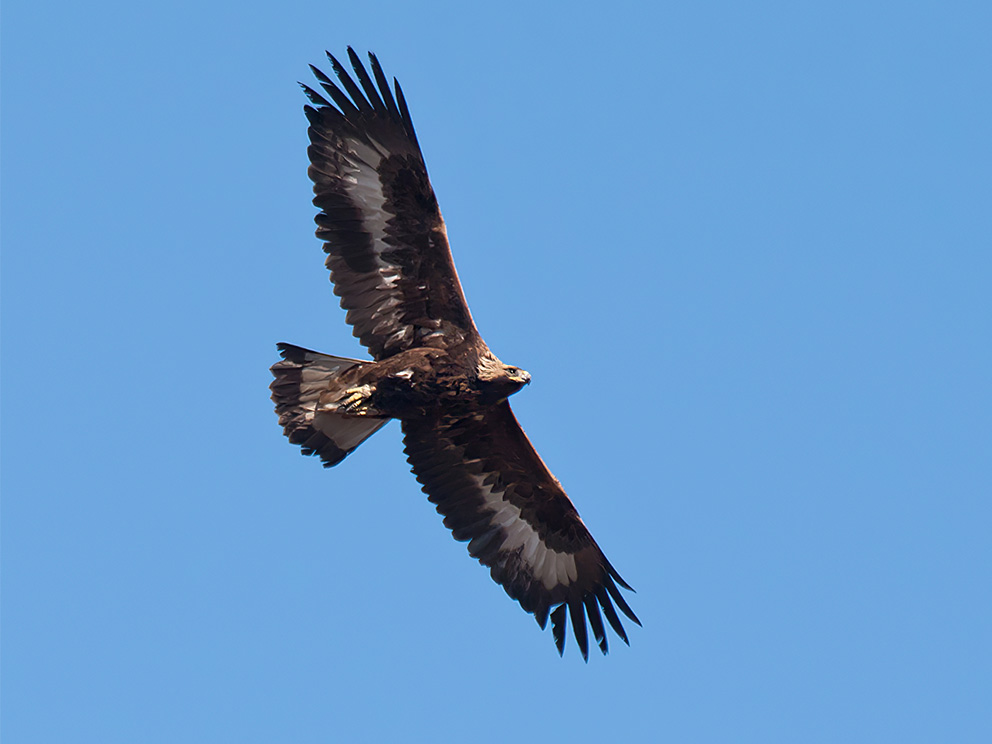 Summary. Golden Eagle − Aquila chrysaetos. Due to the rare occurrence of the species in Latvia, it is impossible to assess changes in distribution with the use of statistical methods; however, it is likely to have increased along with the increase in the size of the population. AOO of the birds breeding in Latvia is 56 km2, EOO – 25,584 km2. The breeding population in Latvia is estimated at 9–12 pairs (18–24 adult individuals). The population is increasing in the long term as well as in the short term. Usually breeds in forests on bog islets or bog edges. The species is threatened in Latvia by lead poisoning from feeding on the remains of game. The species is sensitive to disturbance and is therefore threatened by forestry and peat extraction, as well as by users of recreation services. Birds probably die on power lines. In the future, the species may also be affected by the development of wind farms. The legal status of protected species needs to be maintained in Latvia. The protection of the species requires the establishment of micro-reserves in breeding areas and the elimination of disturbances during the breeding season. The use of lead ammunition for hunting must be stopped.