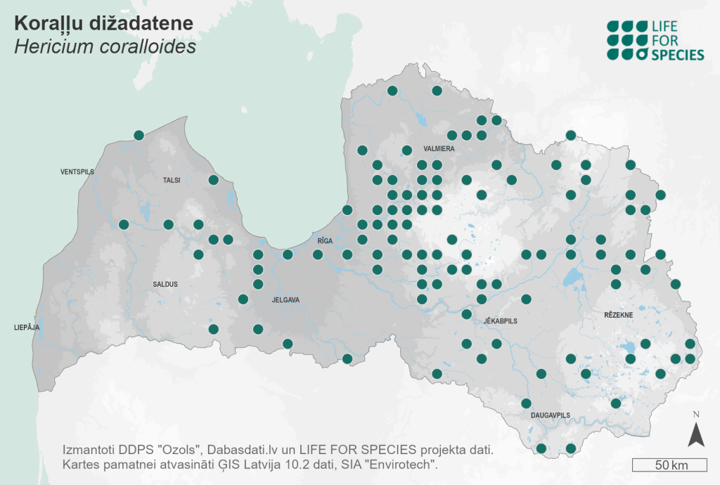 Summary. Coral tooth – Hericium coralloides. A cosmopolitan species, widespread in all forest zones of Europe, and relatively common in Latvia, with 280 known localities. The EOO is 61,255 km2, and the AOO – 616 km2. There are insufficient data on regional population size and changes. The total number of mature individuals is about 1,100. It is a wood saprotroph, causing white rot. It grows on dead standing trees and logs of deciduous trees (aspen, birch) in deciduous and mixed forests. The species is threatened by the decline of old deciduous forests and the lack of dead wood in such forests. It is assessed as Vulnerable (VU) due to its small regional population. A protected species in Latvia – its legal status needs to be maintained. Approximately 42% of the species’ localities are in protected nature areas, such as the Gauja and Ķemeri National Parks. To protect the species, areas of old mixed and deciduous forests and dead wood in them should be preserved. Research is needed on the occurrence, ecology and threats to the species.
