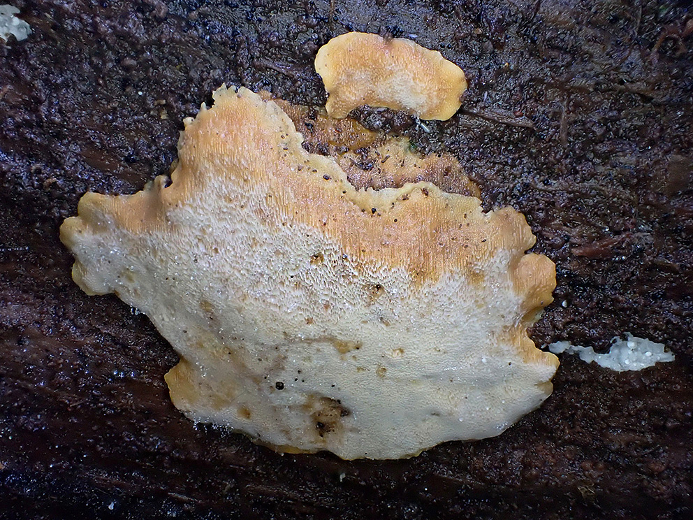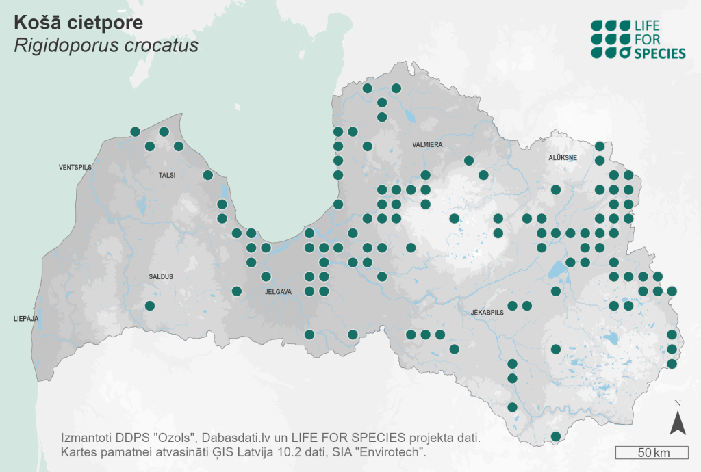 Summary. Saffron porecrust – Rigidoporus crocatus. Found in coniferous and mixed forests of the Northern Hemisphere; in Europe more common in the hemiboreal zone. It is relatively rare in Latvia; more than 250 localities are known. The EOO is 64,914 km2, and the AOO – 1,052 km2. There are insufficient data on the regional population size and changes. The number of mature individuals is estimated at about 2,700. It is a wood saprotroph, causing white rot. It develops on logs of various tree species, in moist and wet areas, sometimes also in drained forests near ditches. The species is threatened by the decline of old deciduous forests, a lack of dead wood in old forests and changes in microclimate due to forest drainage. It is assessed as Vulnerable (VU) due to its small population and expected further decline. A protected species in Latvia; its legal status must be maintained. About one-third of the regional population is located in protected nature areas – the Gauja and Ķemeri National Parks, the “Vjadas meži” and “Gulbju un Platpirovas purvs” Nature Reserves, and others. The conservation measures are mainly related to the maintenance of suitable habitats. Research is needed on the distribution, ecology and threats to the species.