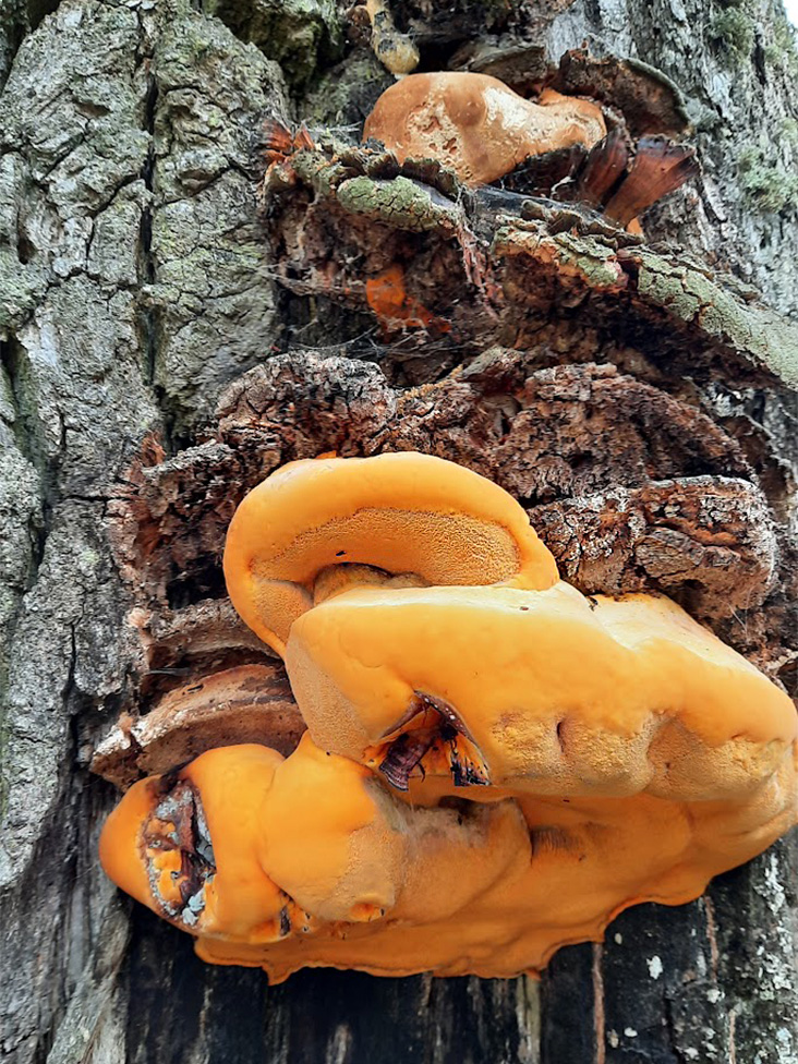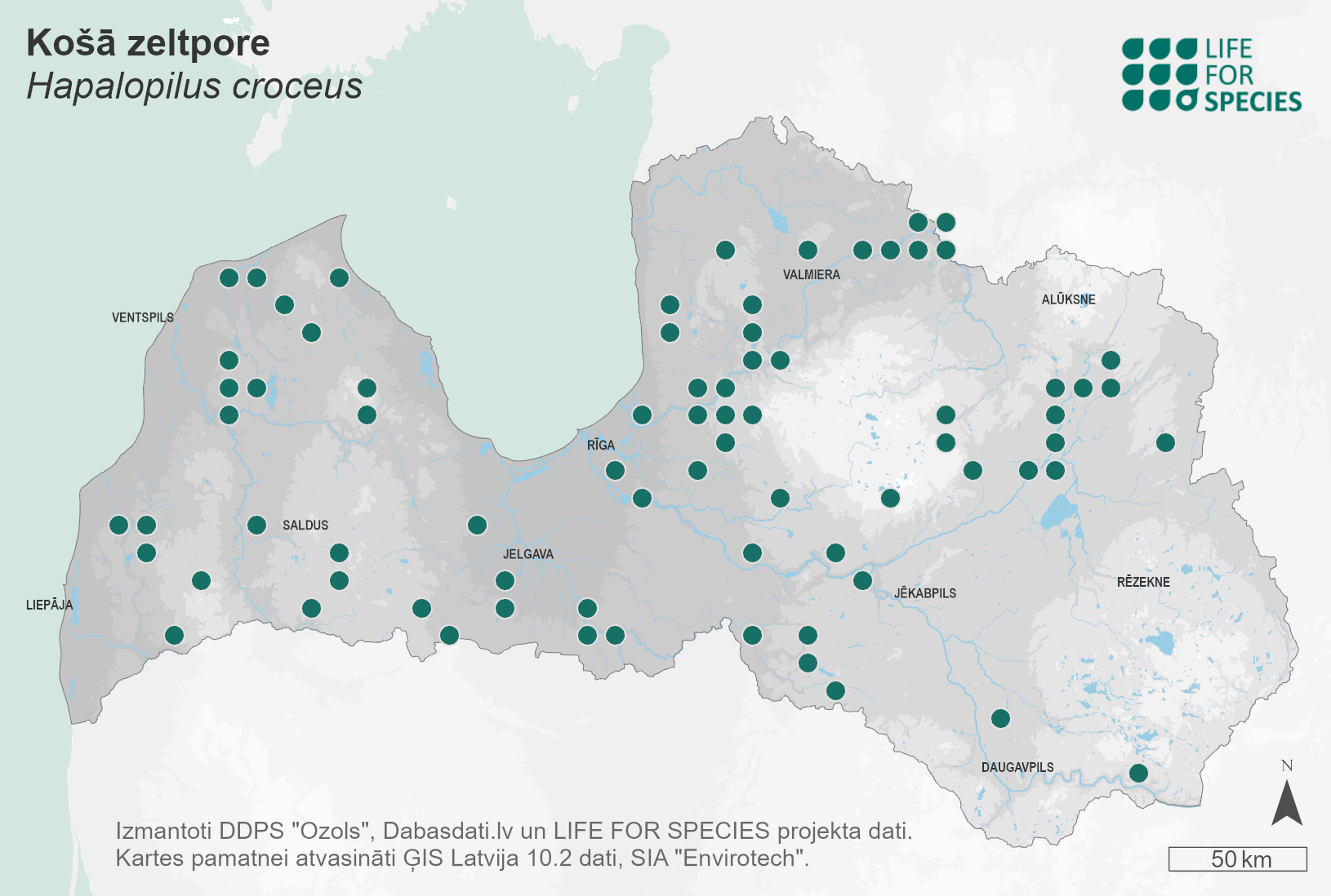 Summary. Orange polypore – Hapalopilus croceus. Its range covers the Northern Hemisphere. Worldwide, its distribution is declining due to a sustained reduction in broadleaved forest cover. It is relatively rare in Latvia, with more than 70 known localities in different regions. The EOO is 55,562 km2, and the AOO – 232 km2. There are insufficient data on the size of the regional population and its changes. It is considered to be relatively stable, approximately 600 mature individuals. It is a wood saprotroph, causing a characteristic white pocket rot, however, the decay is relatively slow. It grows on dead oak wood (very rarely on other deciduous trees; found on linden in Latvia), often in cracks and cavities of living trees, but can also be found on logs. It is found in broadleaved forests, wooded meadows, alleys, greenery, open landscapes on solitary large trees. The species is threatened by a probable lack of suitable substrate in the future, e.g. due to a decrease in the proportion of forests with oaks of different ages, and the loss of old oaks. It is assessed as Endangered (EN) due to small AOO and its predicted decline; the reduction in the area and quality of suitable habitat and in the number of mature individuals are expected. A protected species in Latvia for the conservation of which micro-reserves can be established. Its legal status must be maintained. Approximately 70% of the species’ localities are in protected nature areas, such as the Gauja National Park, the “Ziemeļgauja” Protected Landscape Area, etc., or on state-protected noble trees. The conservation of the species requires the preservation of old oaks, as well as dead oaks and their logs, and the promotion and maintenance of wooded meadows. The presence of young and mature trees in suitable habitats is necessary to ensure future substrate and to allow the species to move from one tree to the next. Research is needed on the distribution, ecology and threats to the species.