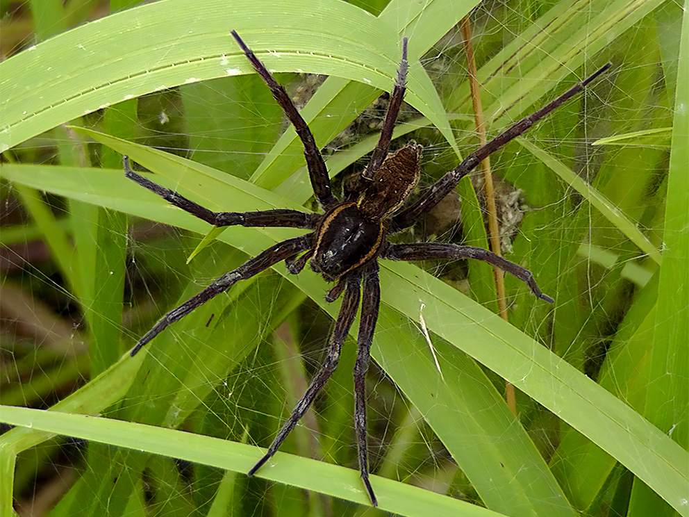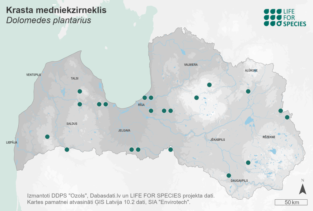 Summary. Great raft spider – Dolomedes plantarius. Found in Eurasia – throughout Europe (except Ireland), in Kazakhstan and parts of European Russia to southern Siberia (Nentwig et al. 2021). There are 26 localities of the species in different regions of Latvia. The EOO is 36,280 km2, and the AOO is 104 km2. The species has been little studied, so it is not possible to evaluate distribution changes in its distribution over time. In Northern Europe, the regional population status is stable, whereas in the UK, France and Italy, the regional populations are declining (Milano et al. 2018). No quantitative studies have been carried out on the size and status of the regional population in Latvia. There are shared subpopulations with both Lithuania and Estonia. In areas where there are water bodies with undisturbed banks, subpopulations are likely stable. Comparing the data from the previous Red Data Book of Latvia (Šternbergs 1998) (two localities), it can be assumed that the regional population has increased and could be considered stable. The species mainly inhabits areas of stagnant water, including fens, lake margins and mires, where open water areas are available, but with little human impact (Duffey 1995; Almquist 2005; Milano et al. 2018). In Latvia, the species has been found on the shores of lakes and rivers and in mires. The occurrence and distribution of the species are threatened by changes in its habitats: reduction in the number and area of wetlands, degradation of fens, eutrophication and overgrowth of the water bodies, leading to population fragmentation and subsequent genetic isolation (Smith 2000). Seasonal drying of their habitats is also a threat (Harms et al. 2009). Increasing anthropogenic pressure, both on the coast (vegetation removal) and in the water (increased use of motorised vehicles), can lead to the disappearance of the species in the area (Duffey 2012). The species is assessed as Near Threatened (NT), as it has 26 known localities, is threatened by habitat changes, and is estimated to be declining in Europe. The species is not listed as a species of EU importance or protected species in Latvia. There is no need to establish legal protection for it. Currently, 49% of the localities are in protected nature areas – the Gauja and Ķemeri National Parks. Further research is needed to clarify the regional population size, distribution and influencing factors, as well as the life cycle of the species.