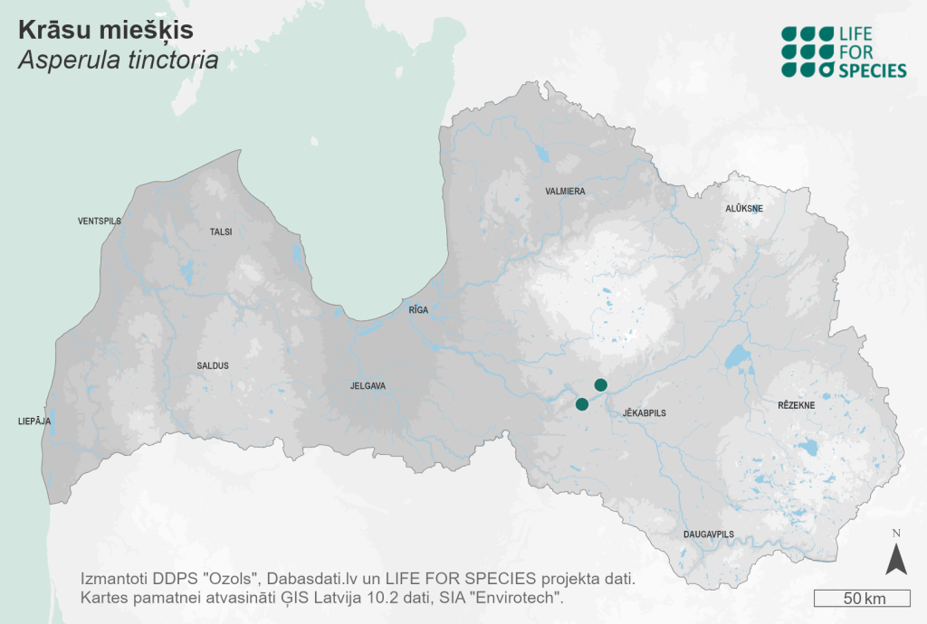 Summary. Dyer’s woodruff – Asperula tinctoria. Very rare in Latvia, with only three sites known in central Latvia in the River Daugava Valley between Pļaviņas and Klintaine, where the species was observed in 2002 and 2010. The species grows close to the northern border of the range. The AOO is 8 km2, and the EOO is 8 km2. Most of the species’ localities were destroyed by expanding the Pļaviņas dolomite quarries. There are no studies on the changes in the distribution of the species, population size and its dynamics in Latvia. In Latvia, the species is found in dry pine forests, forest edges, dry calcareous meadows on the terraces of the River Daugava Valley, on dolomite outcrops, in abandoned dolomite quarries. It may also be found on roadsides and field edges. The species is threatened by the deterioration of suitable habitats due to conversion of meadows into arable land, cessation of semi-natural grassland management and building construction. The known species localities where it was last recorded are located outside the protected areas. A survey on the species’ habitats, the population size, and threatening factors is needed. It is necessary to ensure the preservation of habitats suitable for the species by appropriate protection regime, including restoration and maintenance of the A. tinctoria habitats.