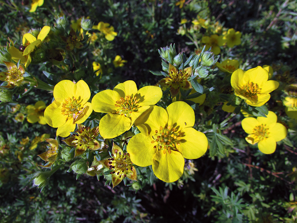 Morfoloģija un bioloģija. Daudzgadīgs vasarzaļš, līdz 150 cm augsts divmāju krūms. Dzinumi ar matiņiem, vēlāk kaili, sarkanbrūni vai pelēki. Lapas nepāra plūksnaini saliktas, abpus ar matiņiem, pielapes plēvjainas. Lapiņas 5–7, iegarenas līdz lancetiskas. Ziedi pa vienam lapu žāklēs vai skrajās, vairogveidīgās ziedkopās zaru galos. Ziedkāts un kauss ar zīdainu matojumu. Vainaglapas koši dzeltenas. Zied no jūnija līdz septembrim. Aug kā atsevišķi indivīdi, nelielās grupās vai tīraudzēs. Saulmīlis. Dekoratīvs (Eglīte 2003).