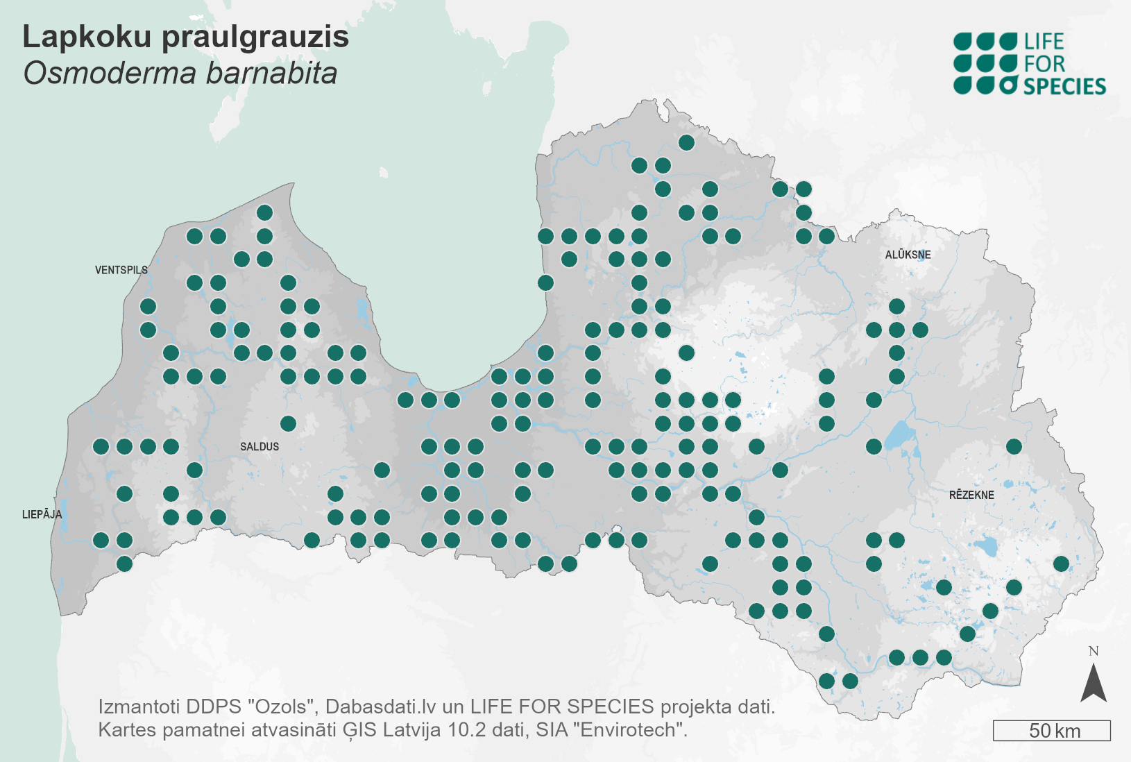 Summary. Hermit beetle – Osmoderma barnabita. It is an Eastern European species that also occurs in north-eastern, Central and some parts of south-eastern Europe (Bezděk 2016). The Latvian regional population is not isolated from other regional populations. In Latvia, the species is unevenly distributed throughout the country (Ranius et al. 2005; Telnov, Gailis 2006). The EOO is 66,932 km2, and the AOO is 1,352 km2. Some of the records and localities are questionable, and, according to an expert’s assessment, the actual AOO is smaller. Studies on the Latvian regional population size have not been carried out. The status and trends of the Latvian regional population are assessed as unfavourable-bad (DAP 2019). Osmoderma barnabita is a stenotopic, saproxylophagus species (Koch, 1989). In Latvia, most of the sites are in human-made habitats (old parks, avenues) and wooded meadows. Larvae develop in various hollow trees of which the most important species are small-leaved lime, pedunculate oak, and Norway maple. The main threat is the continuous decline of habitat quality and AOO. Inhabited and potential trees for O. barnabita are regularly cut down throughout the country, including in protected areas, often on a large scale, ignoring the legal requirements. In the last decade (2010–2020), several localities were completely destroyed or significantly negatively affected. The species is assessed as Vulnerable (VU) due to a small AOO, strongly fragmented regional population and the continuous decline of the AOO, habitat area and its quality, as well as the number of mature individuals. It is included in the 2nd edition of the Red Data Book of Latvia (Cinītis 1998). The hermit beetle is on the list of species of EU importance and is protected in Latvia, where micro-reserves can be established to preserve its habitats. The legal status of the species in Latvia must be maintained. The most important and urgent tasks for slowing the decline of the regional population are: a) imposing strict control over habitat destruction; b) no inhabited or potential tree should be cut or removed prior to obtaining a permit from the Nature Conservation Agency on the basis of a certified expert opinion; c) conducting an inventory of existing localities, identifying their status, planting new trees to reduce the time gap; d) transfer of individuals (beetles and larvae) to other trees to be insured in case an inhabited tree is cut; e) ecological corridors to be established in order to connect isolated sites; f) artificial habitats (nesting boxes) to be installed to preserve the existence of small and depleted subpopulations.