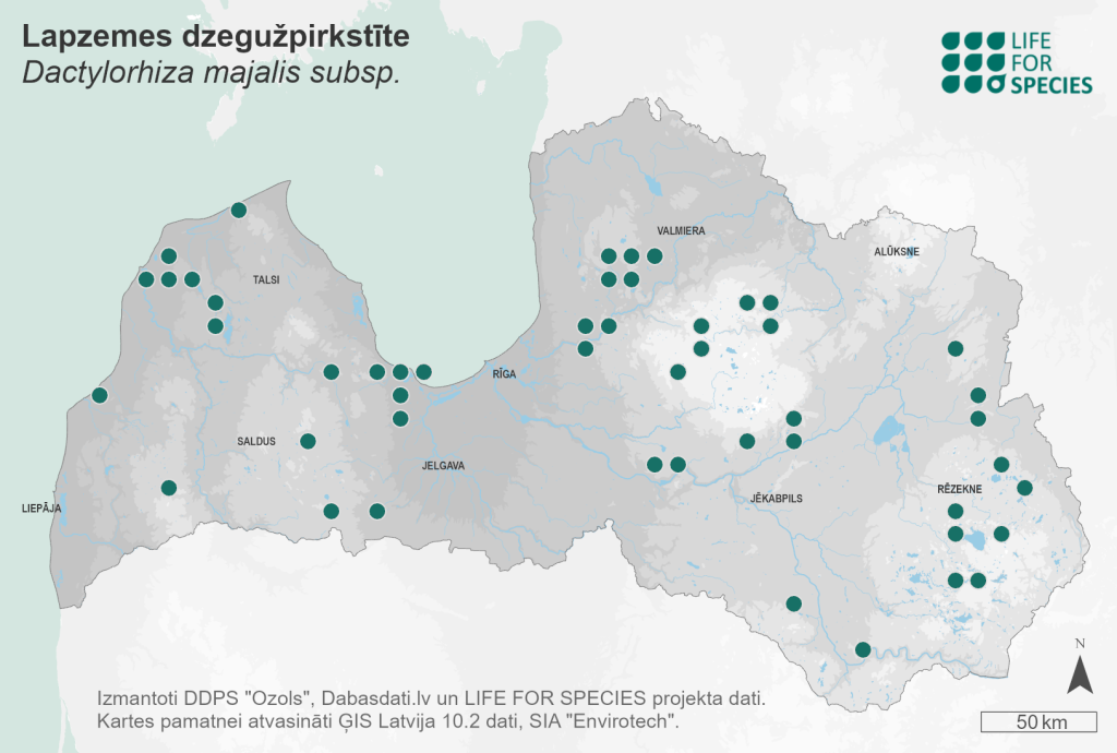 Summary. Lapland marsh-orchid – Dactylorhiza majalis subsp. lapponica. In this publication, we assume that all records of Dactylorhiza russowii (Klinge) Holub in Latvia belong to D. majalis subsp. lapponica. The species is rare throughout Latvia. The EOO is 49,254 km2, and the AOO – 264 km2. Compared to the distribution pattern identified in the early 21st century, the EOO has not changed significantly. There are no data on the size of subpopulations at each locality and population dynamics. According to the available data, the number of individuals per site varies greatly, ranging from 1 to 90. However, the number of localities has most likely decreased over the last thirty years and a longer period due to the drainage of mires and forests, peat extraction, and the cessation of semi-natural grassland and fen management. The condition and area of the suitable habitats decrease, leading to the decline of the population. In Latvia, D. majalis subsp. lapponica has been found mainly in carbonate-rich transitional mires, alkaline fens, and mires around carbonate-rich groundwater discharges. Most known localities occur in the protected areas, e.g., the Ķemeri National Park; however, this does not reflect the actual situation, as these areas have long been popular subjects of research. Habitats suitable for the subspecies are also found outside protected areas. Targeted studies of the subspecies’ distribution and population size, as well as the identification of the most important sites for conservation, are recommended.