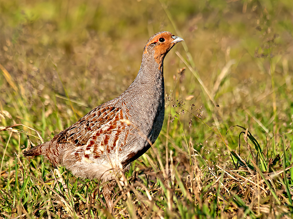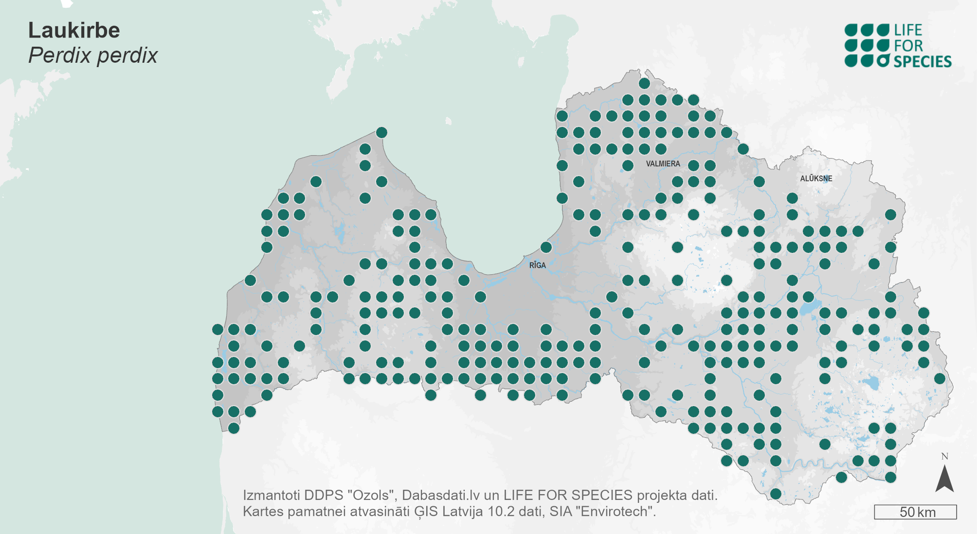 Summary. Grey Partridge − Perdix perdix. In Latvia, the distribution of species declined between 1980–1984 and 2000–2004; the decline continued between 2000–2004 and 2013–2017 as well. The AOO of the breeding population is 2,080 km2, the EOO – 81,060 km2. The breeding population is estimated to be 500–1,100 pairs (1,000–2,200 adult individuals) in size. Although the population is declining in the long term, it is stable in the short term. The species inhabits a variety of field edges, ditches and border belts between grasslands, cultivated meadows, pastures, cereal fields and fallow land. In winter, they are often found on the outskirts of settlements and in their vicinity. The species is threatened by the increase in agricultural intensity. The legal status of protected species needs to be maintained in Latvia. Maintenance of field boundaries and roadsides without moving them every year is required to conserve the habitat of the species in order to provide food – plant seeds for adult birds and insects for the juveniles – and hiding places for nests.