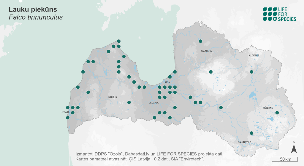Summary. Common Kestrel − Falco tinnunculus. In Latvia, the distribution declined considerably between 1980–1984 and 2000–2004, while no significant change occurred between 2000–2004 and 2013–2017. The AOO of the breeding population is 252 km2, the EOO – 57,300 km2. The breeding population is estimated at 238–5,439 pairs (476–10,878 adult individuals). The long-term trend is unknown and the short-term trend is unclear, however, estimates suggest that the population could decline by 25% within three generations. Inhabits a diverse cultural landscape, where fields are interspersed with farmsteads and small clusters of forests or isolated trees, including cities. The threats have not been studied in Latvia, therefore, the threats indicated in the European assessment that might be relevant for the Latvian population have been described here. Intensive agriculture is the main threat to the species. Potentially, the species may be threatened by the development of wind farms. Monitoring of the population is ongoing. The legal status of protected species needs to be maintained in Latvia. Conservation of the species requires ensuring diversity, including unproductive areas in the agricultural landscape, as well as the reduction of pesticide use.