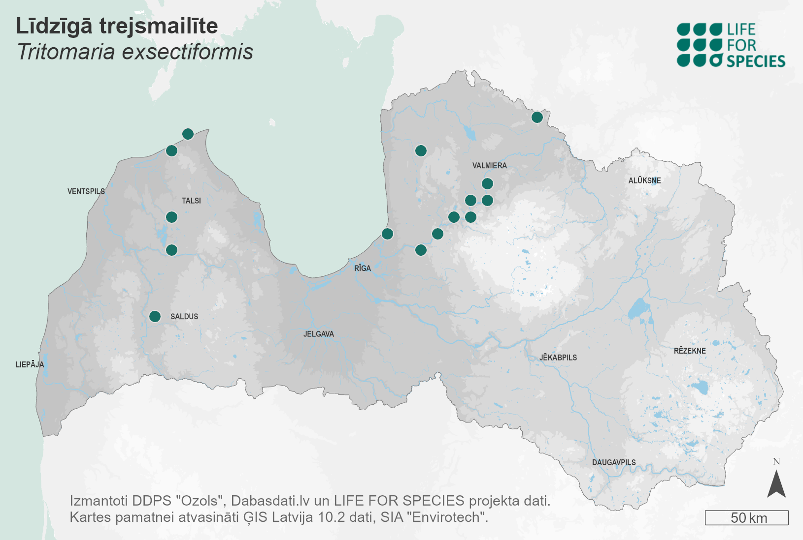 Summary. Larger cut notchwort – Tritomaria exsectiformis. A widespread liverwort in most European countries, except Russia and the northern regions of Scandinavia. It was first found in Latvia by J. Mikutowicz in 1906. Today, it is found mainly in Vidzeme in the Gauja Valley, and is also relatively common in Kurzeme. It has not been found in Latgale and Zemgale in the last 50 years. The species is known to be present in 22 localities in Latvia today. EOO is 17,309 km2, and AOO is 80 km2. No studies have been carried out in Latvia; the subpopulations are considered stable. In Latvia it grows mainly on sandstone outcrops, with several records on soil in forest roads or trails, as well as in spring fens; one record also in a raised bog. The species is threatened by natural succession of sandstone outcrops, mechanical destruction on paths and forest roads. In view of existing threats, it is assessed as Near Threatened (NT). A protected species in Latvia. The legal status of the species must be maintained. The species is found in protected nature territories – the Slītere and Gauja National Parks. Protection of the localities of the species should be ensured and studies on the distribution and size of the population of the species should be carried out. The condition of historical localities needs to be clarified.