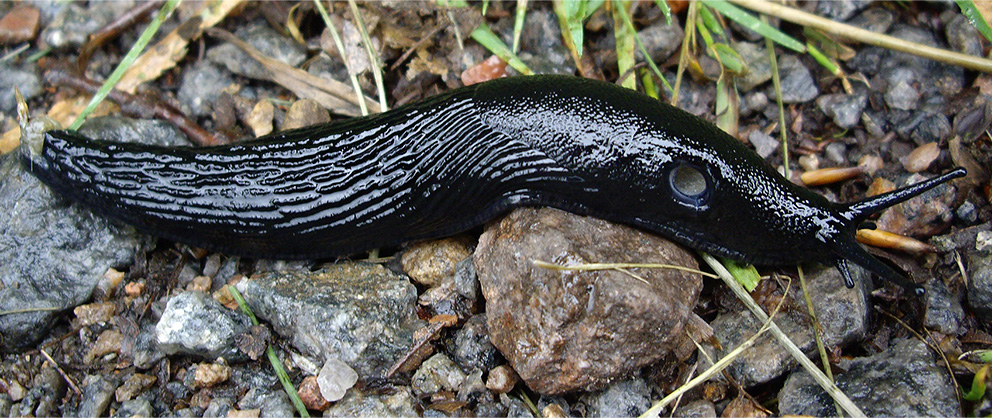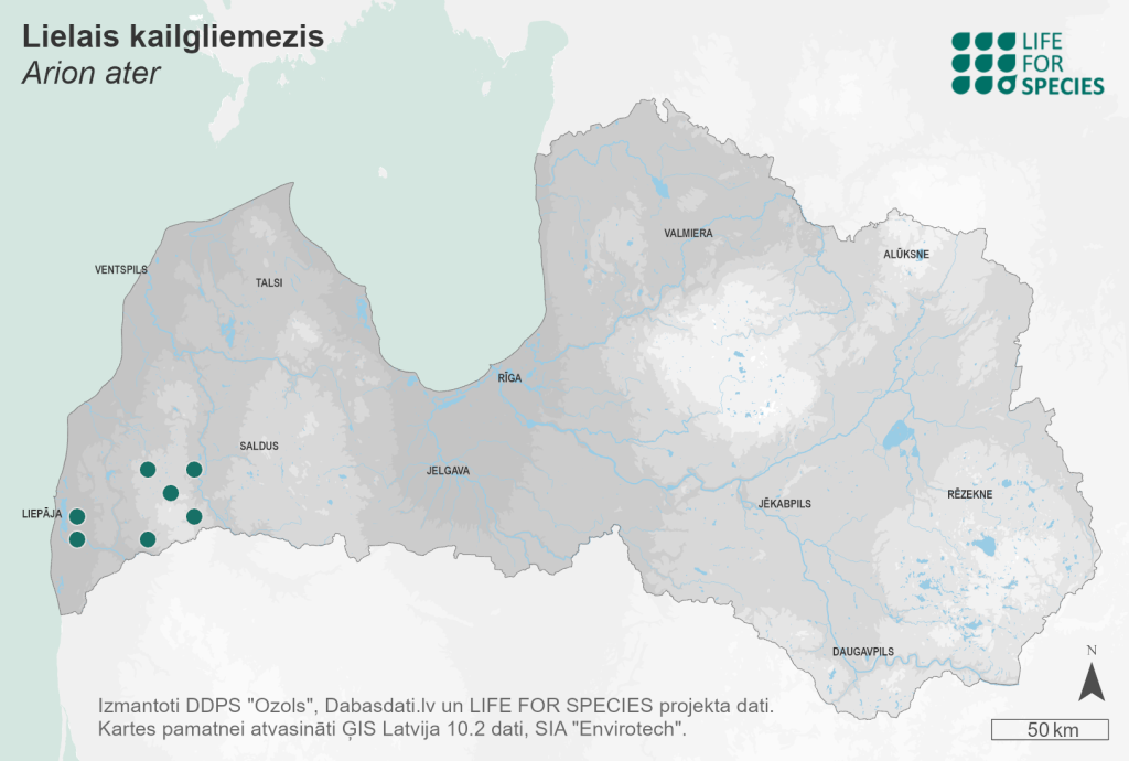Summary. Black slug – Arion ater. No studies have been carried out on the regional population size and trends in Latvia. The EOO is 1,127 km2, and the AOO is 40 km2. The protected habitat types in Latvia in which the species occurs are old mixed broadleaved forests, swamp woods, forests of slopes, screes and ravines. It may also occur in less natural habitats near water, in cultivated grasslands and parks. The invasive species A. vulgaris and A. rufus have become established in the area of occupancy of A. ater and in the vicinity of some of its localities in Latvia. For this reason, a reduction in the distribution of A. ater is expected, and a possible extinction, which may be caused by hybridisation with the A. vulgaris and A. rufus over time. Priority should be given to limiting and eradicating the spread of invasive slug species in and around settlements within the range of A. ater. Based on the threat posed by invasive slugs and considering its small EOO and AOO in Latvia, the species is assessed as Endangered (EN). Two of the ten known localities of the species are in the “Embūte” Nature Park and in a micro-reserve near the Otaņķe River in south-western Latvia. The species is not protected in Latvia. It is proposed to be included on the Latvian list of protected species.