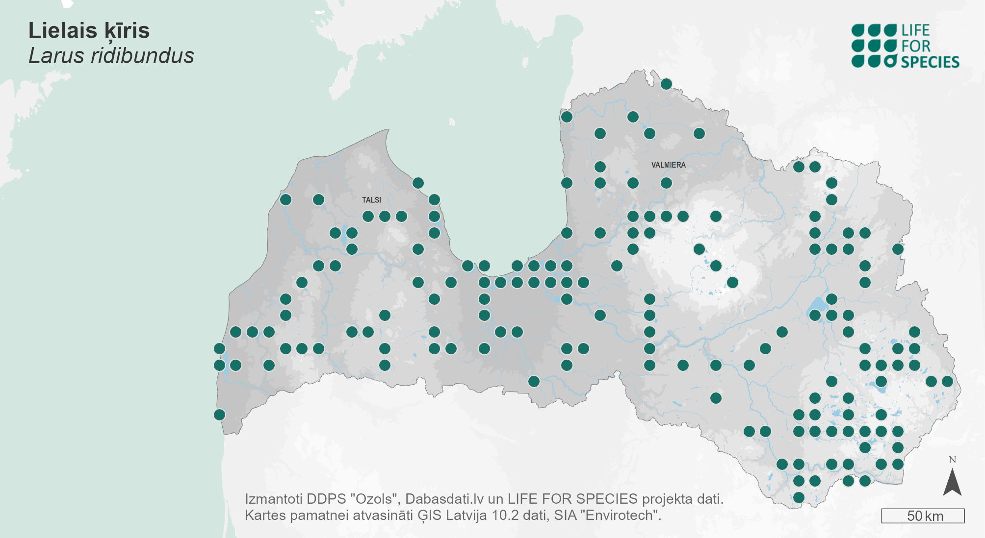 Summary. Black-headed Gull − Larus ridibundus. The distribution in Latvia has not changed significantly since the 1980s. The AOO of the breeding population is 1,032 km2, the EOO – 76,979 km2. The breeding population is estimated at 24,539–38,200 pairs (49,078–76,400 adult individuals). The long-term, as well as short-term population trend, is negative. Over three generations, the population has declined by 60%. It mainly breeds in overgrown inland waters – lakes, ponds and quarries. They forage in fields, landfills, animal farms, fish factories, and over water. In Latvia, the main reasons for the steep decline in numbers include a reduction in food availability (from fisheries and animal farm waste), the impact of Neogale vison, and a reduction in habitat availability due to grassland abandonment and climate change. The European assessment indicates that the species is susceptible to avian influenza and avian botulism and may be threatened by future outbreaks of these diseases. It can also be threatened by oil spills. The species has also suffered from egg harvesting in the past. In some parts of its range, chemical pollution has a negative impact on breeding success. The legal status of protected species needs to be maintained in Latvia. The protection of colonies, including the prevention of disturbances during the breeding season, is required for the conservation of the species.