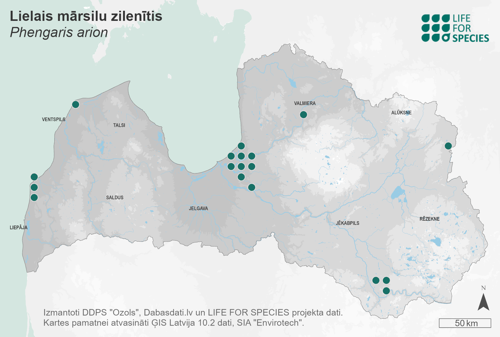 Summary. Large blue – Phengaris arion. Found in Europe and Asia. In Western Europe, most regional populations are threatened. The species is now extinct from the British Isles (later reintroduced) and the Netherlands. The species has been recorded in all of Latvia’s neighbouring countries. Latvia is within the core part of its range. The species has been recorded in various regions of the country. The EOO is 44,903 km², and the AOO is 164 km². In Latvia, it is distributed unevenly and is not uncommon in some places (Akmeņrags, Daugavpils, Garkalne, Ādaži) (Savenkov, Šulcs 2010). Quantitative studies on the regional population sizes and changes have not been carried out in Latvia. Found in dry pine forests and heaths, as well as in burned areas with food plants Thymus spp. The species is threatened by habitat changes such as intensive forest management, habitat destruction (building development, etc.) and natural succession leading to the loss of the food plant. It is assessed as Near Threatened (NT) due to its local occurrence, extinction in several localities, complex and thus fragile life cycle. It was not assessed as Endangered (EN) according to the calculated AOO, due to the lack of data on the decline of the regional population. It is a species of EU importance and protected species in Latvia. It must be included on the list of protected species for which micro-reserves can be established. Conservation should focus on preserving the necessary habitats for the species in and around its habitats (preventing immoderate overgrowth), as well as searching for new localities, educating experts and nature enthusiasts about the species and its habitats.