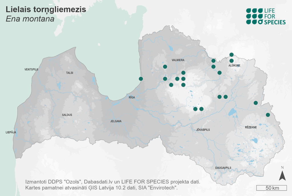 Summary. Mountain bulin – Ena montana. Widespread in Central and Eastern Europe. In Western Europe, the distribution of E. montana is fragmented. It is found in all of Latvia’s neighbouring countries. In Latvia, the species is distributed in the northeastern part of the country and is rare. There are 77 known localities, most of them in the Vidzeme Uplands. The EOO is 11,914 km2, and the AOO – 112 km2. The potential AOO is approximately 500 km2. The number of snails per square metre may vary from one to 18 individuals. In some sites it may be one of the dominant species. The species inhabits natural deciduous and mixed forests of different ages, mainly in areas with distinct terrain. In humid weather, it stays on tree trunks. It is tolerant to extensive forestry. The main threats in Latvia are fragmentation and isolation of natural habitats, their reduction and degradation due to economic activities. Practical protection of forest habitats of EU importance outside protected nature areas is of great importance for the conservation of the species. The species is assessed as Endangered (EN) based on threats from economic activities and its small AOO and EOO. It is included in the 2nd edition of the Red Data Book of Latvia (Pilāte 1998). The species is protected in Latvia and micro-reserves can be established for its conservation. The legal protection status of the species must be maintained. Most of the localities are found in protected nature areas.