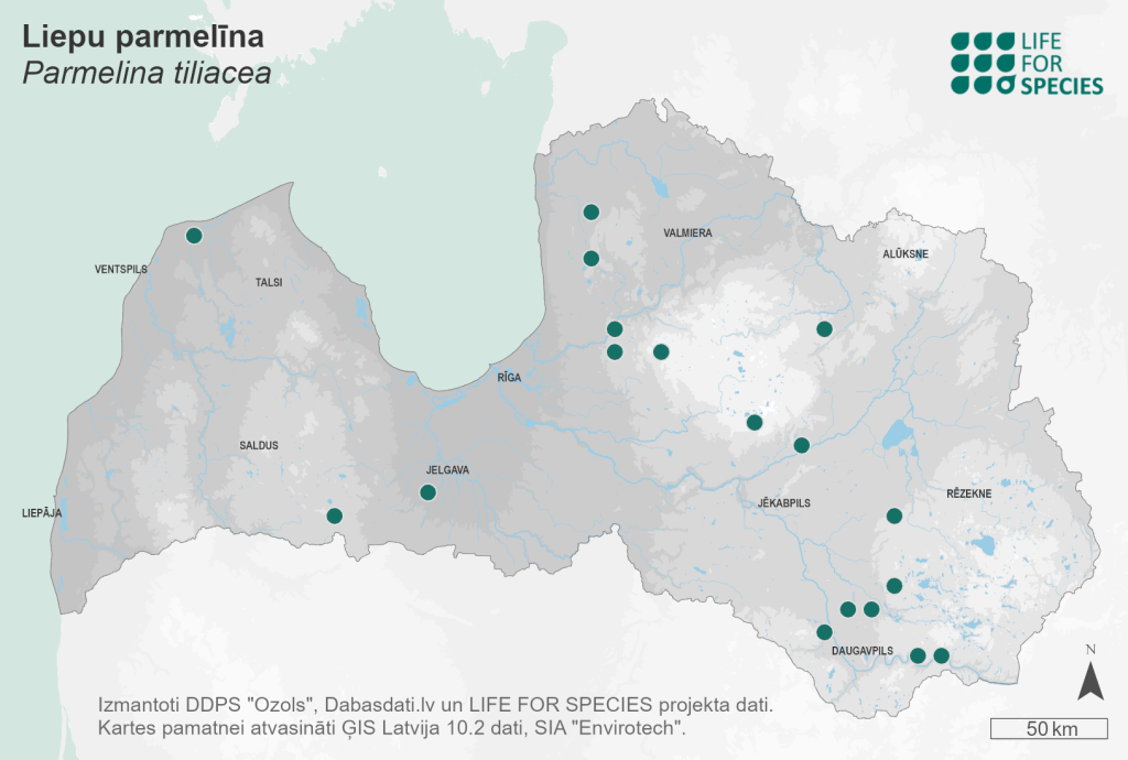 Summary. Parmelina tiliacea is found in North America, Europe and Asia. More than 20 localities are known in Latvia. The EOO is 32,709 km2, and the AOO is 76 km2. This epiphytic species mainly grows on broadleaf trees, most often on lindens. The species is mainly found in sparse, well-lit broadleaf forests, as well as in old parks and alleys. In park-like habitats and alleys, the species is sensitive to felling of old broadleaf trees and their overgrowth in shrubs. It is assessed as Vulnerable (VU) because the number of mature individuals does not exceed 1,000. It is a protected species in Latvia, and micro-reserves can be created for the preservation of its habitats. Its legal protection status needs to be maintained. Approximately a third of the localities are situated in protected areas, for example, in the “Pilskalnes Siguldiņa” Nature Reserve, the Gauja National Park and the “Daugavas loki” Nature Park. Old broadleaf trees should be preserved in park-like habitats, alleys and forests; in the park-like habitats, reducing shading around trees inhabited by the species may be necessary.