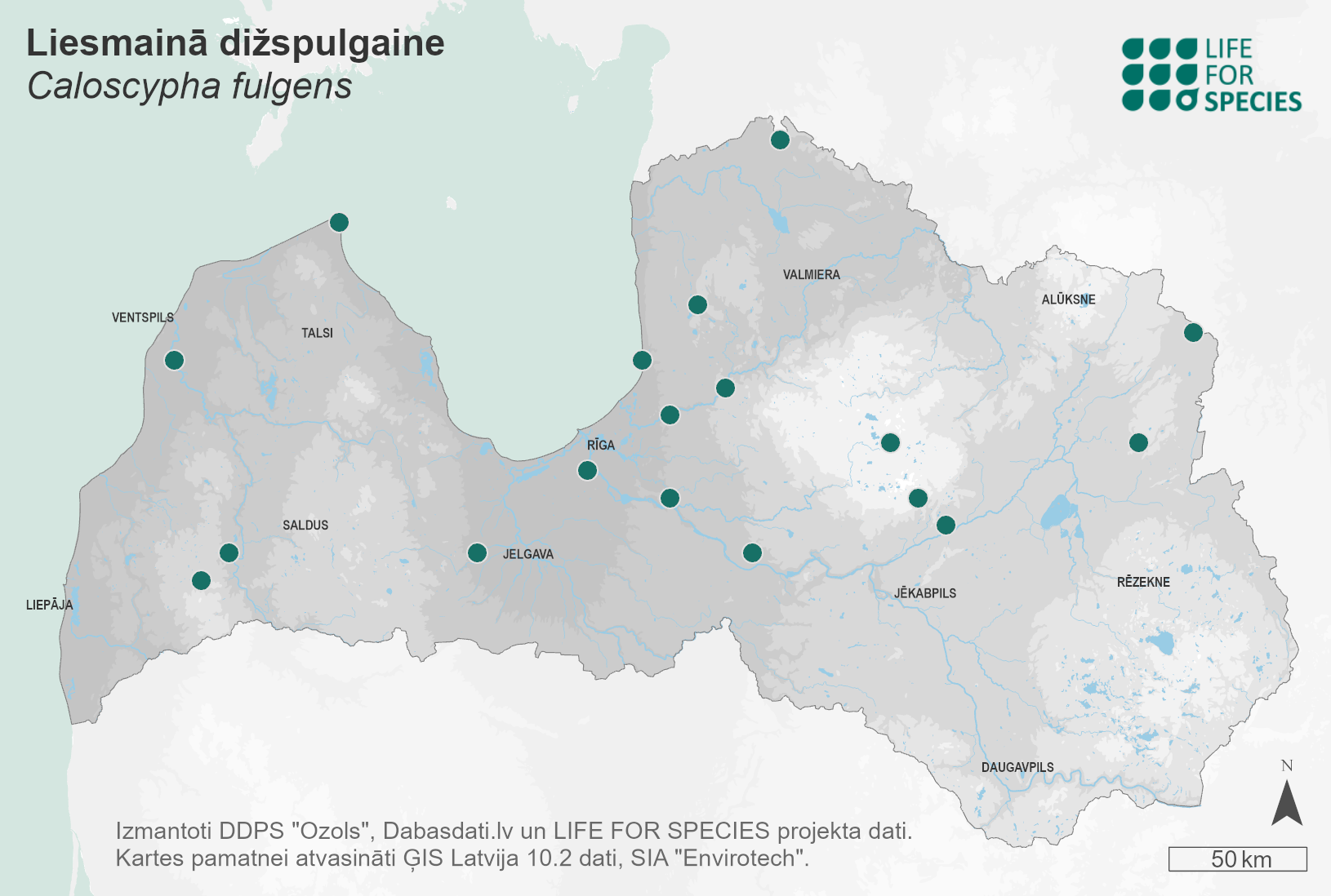 Summary. Golden cup – Caloscypha fulgens. Mainly distributed in Europe, North America, and with places in Asia (Japan). In Europe, it is quite common in the temperate and boreal zones. It is rare in Latvia; currently 18 localities are known, with an even distribution in different regions of the country. The EOO is 44,306 km2, and the AOO – 80 km2. No information is available on changes in the distribution due to a lack of studies; insufficient data on the regional population size and changes. The number of mature individuals is probably less than 1,000. It is a litter saprotroph, and it occurs in coniferous forests, mainly pine, on soil or in mosses. The distribution is negatively affected by the intensive management of pine forests and the reduction in the area of old and natural coniferous forests. It is assessed as Vulnerable (VU) due to the small regional population. The species is not listed as a species of EU importance and is not protected in Latvia. It is proposed to be included on the list of protected species. It is found in protected nature areas – the Slītere National Park, and the “Ogres Zilie kalni” Nature Park. Found mostly outside protected areas. The conservation of the species requires the preservation of suitable habitats - undisturbed pine forests. Research is needed on regional population size, distribution and trends, life cycle and ecology.