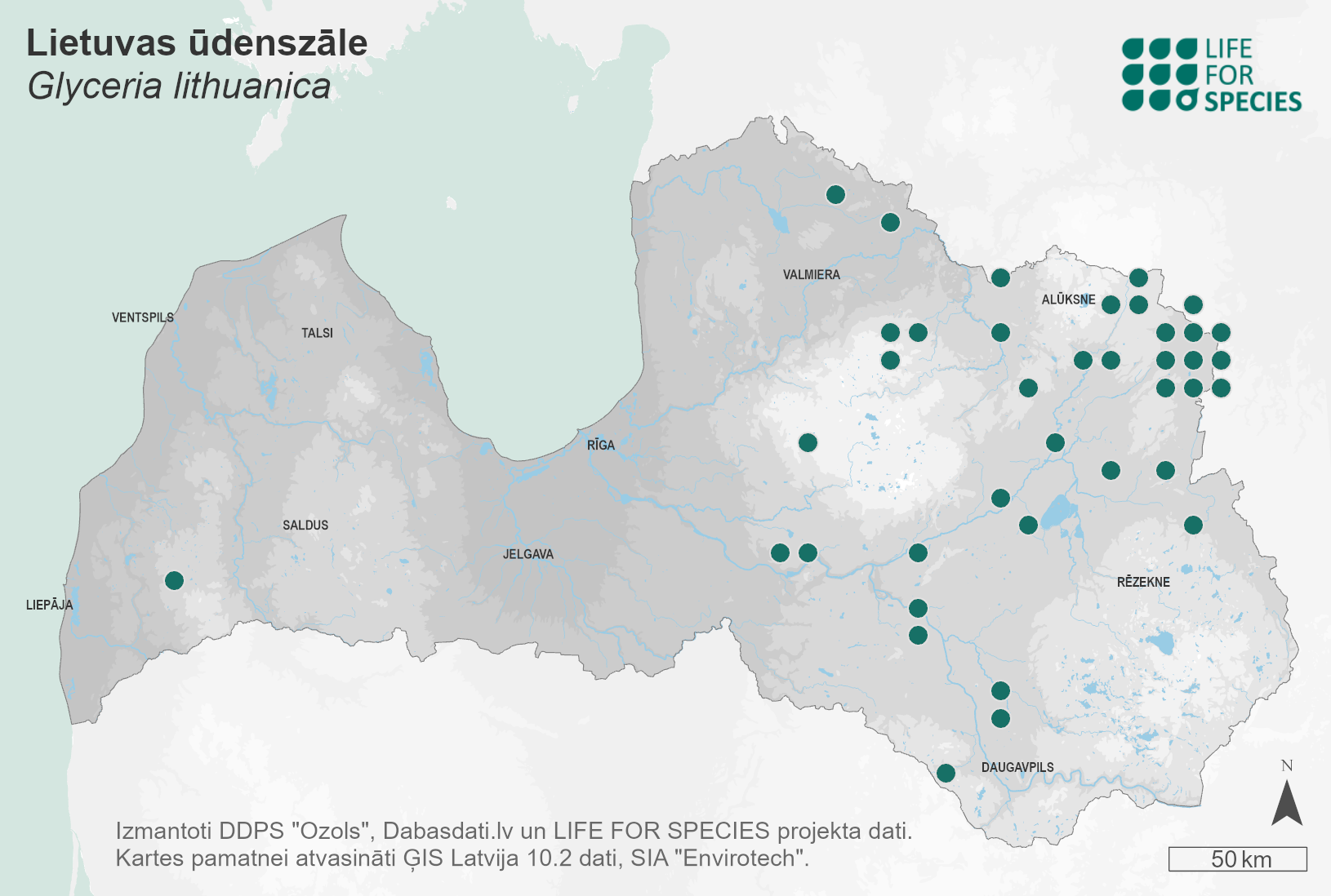 Summary. Glyceria lithuanica is rare in Latvia, occurring almost exclusively in the central and eastern parts of the country, and very rare elsewhere. It grows in small groups in fertile, damp and wet natural coniferous, mixed and deciduous forests and on banks of forest streams. The AOO is 256 km2, and the EOO – 43,550 km2. In Latvia, the species is threatened by intensive forest management (clear-cuts) in old-growth forests and transformation of them into planted monocultures and forest drainage. The population size is unknown in Latvia. The species occurs in at least 11 protected areas. Thus, the largest percentage of the known population may occur in protected areas. The richest populations are known from the following areas: the “Kadājs”, “Virguļicas meži”, “Mežole” and “Aizkraukles purvs un meži” Nature Reserves. The designation of new microreserves or the enlargement of the existing protected areas is recommended. Targeted species’ inventories and estimation of the population size are necessary. Logging and drainage in the species’ habitats should not be permitted.