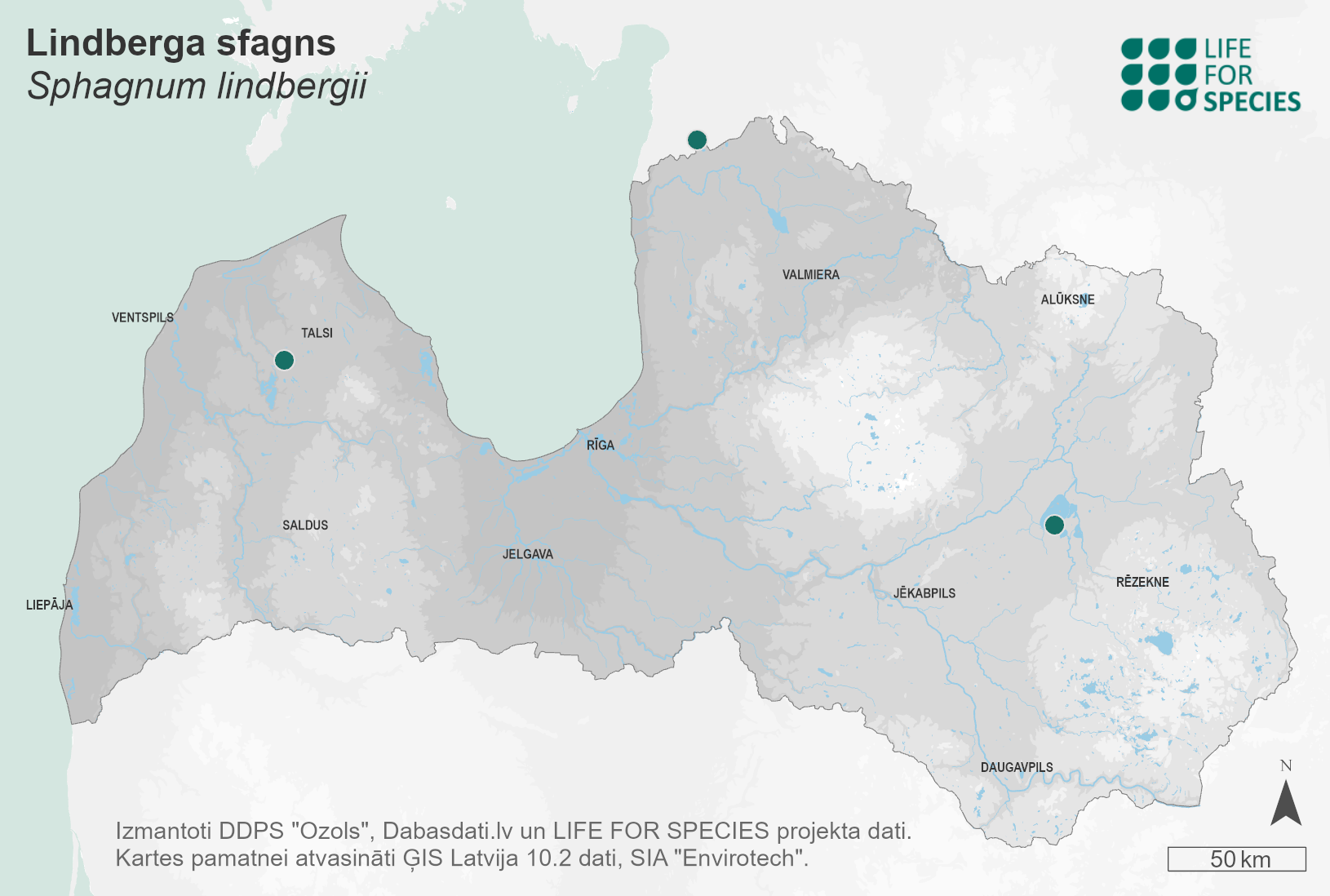 Summary. Lindberg’s bog-moss – Sphagnum lindbergii. In Europe, the moss species is locally common in the southern part of the Nordic countries, but frequent or very frequent in the central and northern part of Fennoscandia. It was first found in Latvia by S. Mayer in 1993. The species is listed as rare in Latvia. EOO is 14,877 km2, and AOO is 12 km2. The regional population size and dynamics are unknown. In Latvia, it grows in natural raised bogs with a pool-ridge complex. Drainage and peat extraction threaten the species. It is assessed as Endangered (EN) due to its small EOO and predicted declines in the area and quality of suitable habitat, and in the number of mature individuals. A protected species in Latvia. The legal status of the species must be maintained. The species has been found only in protected nature territories – the “Ziemeļu purvi”, “Stiklu purvi” and “Lubāna mitrājs” Nature Reserves. Protection of the species’ localities and habitats should be ensured.