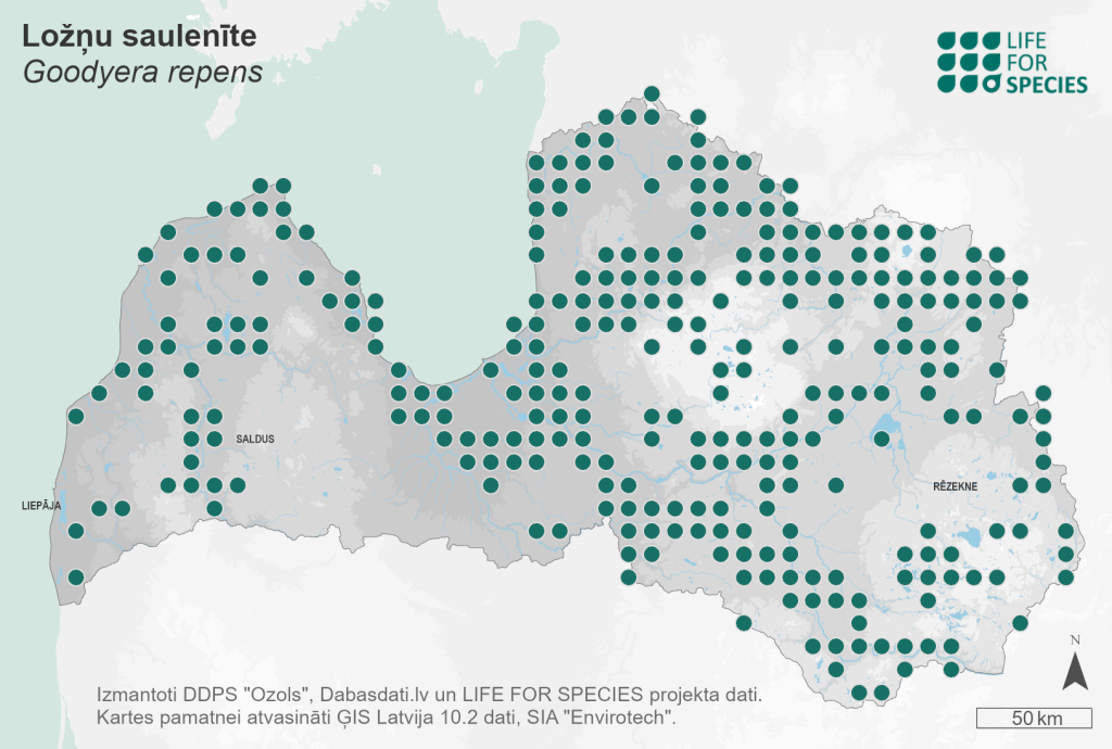 Summary. Creeping lady’s-tresses – Goodyera repens. Relatively common throughout Latvia. The AOO is 3,388 km2, and the EOO – 83,760 km2. The EOO is most likely larger. The EOO has not decreased and still covers the entire country, while the AOO has most likely decreased. During the 20th century due to intensive logging and eutrophication. It is assumed that the population has decreased by at least 15%, but not more than 30%, during the previous three generations (45 years), therefore it is assessed as NT. There is no data on the size of the subpopulations in each locality and the population dynamics. It grows in dry to humid coniferous, mainly pine, forests as single plants or in small groups in partially shaded places. The species is mainly threatened by logging and forest eutrophication. Due to eutrophication, the soil reaction becomes unsuitable for G. repens, the herbaceous and shrub covers in the pine forests increase. Most of the species’ localities occur outside protected areas. It is necessary to determine the population size and to identify areas with the largest subpopulations and to ensure their protection. Logging should not be permitted in the species’ habitats. G. repens should be included on the list of protected species.