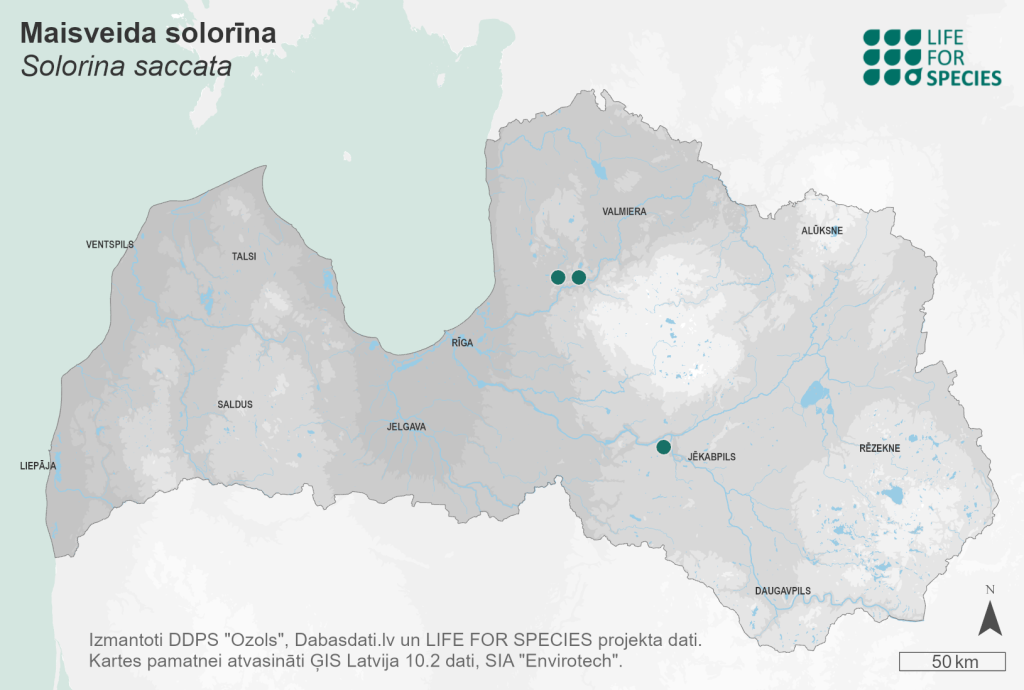 Summary. Solorina saccata is widespread in the Northern Hemisphere. There are four known localities in Latvia, three of them in the vicinity of Līgatne and Lielstraupe and one in the vicinity of Pļaviņas. Historical localities are situated in the vicinity of Kuldīga and Staburags. The EOO is 378 km2, the AOO is 12 km2. An epilithic species that occurs very rarely in Latvia. It is mostly found on ball sandstone outcrops (or other calcareous outcrops). The main threats are associated with the comparative scarcity of substrates available for the species; they are usually small in area and naturally overgrown. Damage to outcrops is an additional threat. Assessed as a Critically Endangered (CR) species because the number of mature individuals does not exceed 50. A protected species. To protect its habitats, the possibility of creating micro-reserves should also be considered. Three of the four localities are situated in the Gauja National Park; furthermore, two of them – in the strict nature reserve zone. The conservation of the substrate inhabited by the species must be ensured, and the localities of the species must be protected from the adverse effects caused by tourists. Removal of competing growth may be necessary at the localities. To improve the status of the regional population, the transplantation or replanting of thallus fragments to other sites that are suitable for the species must be performed.