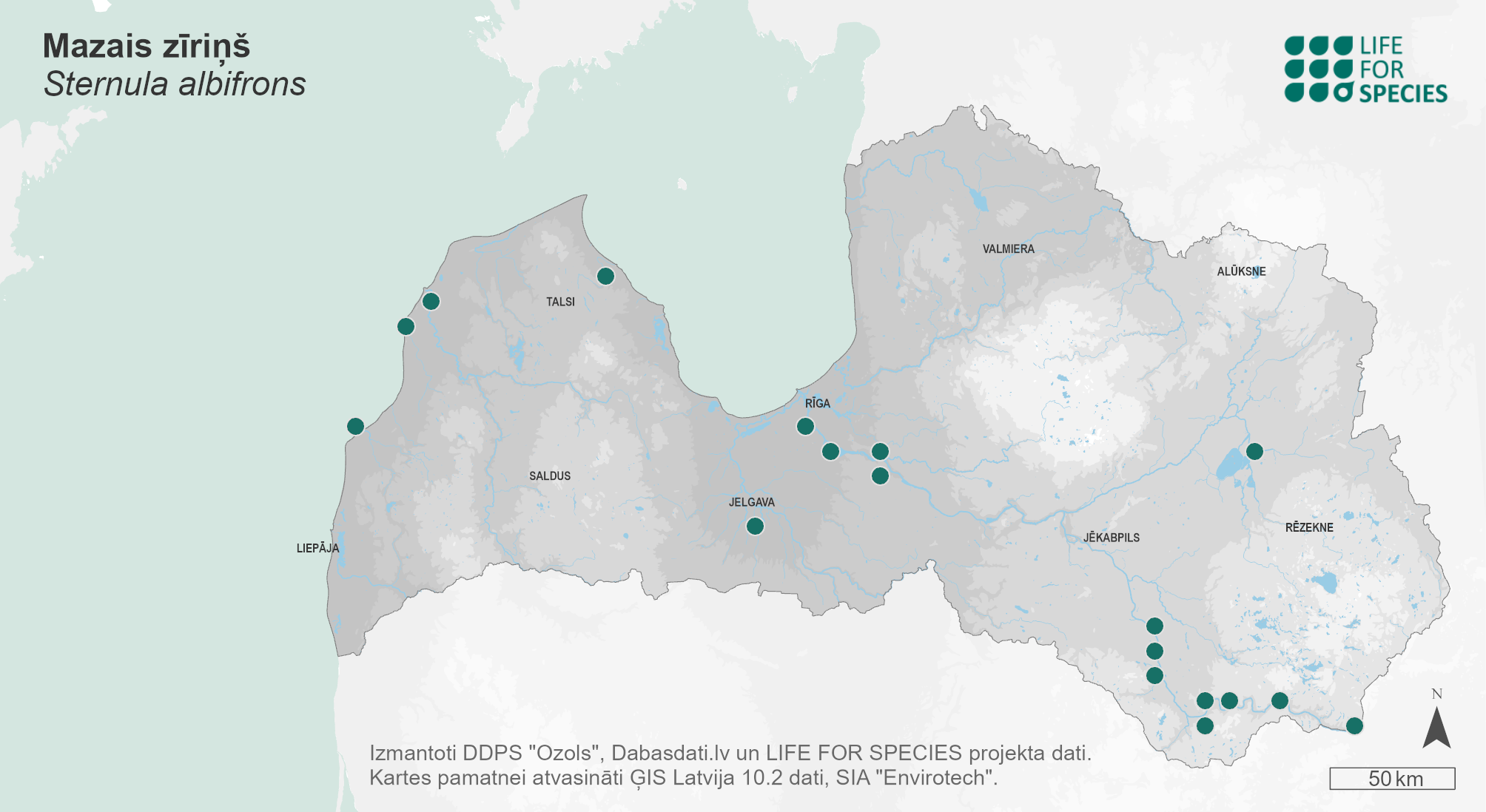 Summary. Little Tern − Sternula albifrons. The distribution in Latvia has not changed significantly since the 1980s. AOO of the population breeding in Latvia is 112 km2, EOO – 35,609 km2. The breeding population is estimated at 70–100 pairs (140–200 adult individuals). The long-term as well as short-term population trend is negative. Over three generations, the population has declined by 72%. The species breeds on the seashore, in Daugava River, and, less frequently, in quarries. The threats have not been studied in Latvia, but it is likely that one of the main threats is the increase in anthropogenic pressure (recreation) on the sea coast. Breeding success can be affected by pesticide pollution. The species is susceptible to avian influenza and may suffer from future outbreaks of the disease. Monitoring of the breeding population is being conducted. The legal status of protected species needs to be maintained. Conservation of the species requires limiting disturbance at existing and potential colony sites.