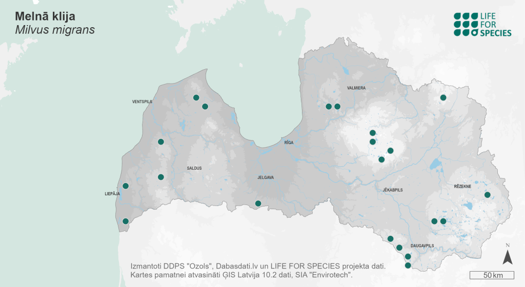 Summary. Black Kite − Milvus migrans. In Latvia, the distribution of species declined between 1980–1984 and 2000–2004, while no considerable change in distribution occurred between 2000–2004 and 2013–2017. The AOO of breeding population is 88 km2, the EOO – 58,731 km2. The breeding population is estimated at 49–74 pairs (98–158 adult individuals). The population is increasing in the long term as well as in the short term. It nests in forests near various water bodies – fishponds, lakes, reservoirs and larger rivers. The species is threatened by water pollution. Forestry activities can affect the habitats and cause disturbance. The species is being persecuted in some parts of Europe. Potentially, the species may be negatively affected by wind farm development. The legal status of protected species needs to be maintained in Latvia. The creation of micro-reserves at breeding areas and preventing the runoff of chemical pollution from agricultural land are required for the conservation of the species.