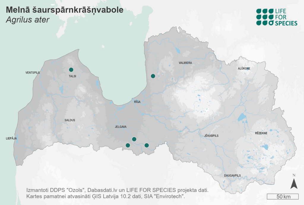 Summary. Jewel beetle – Agrilus ater. A Palaearctic species distributed in Europe from the south-west to the north, but more common in Western Europe. The EOO is 9,000 km2, and the AOO – 24 km2. The potential EOO covers the entire area of the country and the potential AOO is likely over 500 km2. In Europe, the population of A. ater is increasing, and the species recolonised several areas from where it previously disappeared. The status and trends of the Latvian regional population are unknown, but it is inferred that the population is declining or likely to decline due to loss of habitat quality and its extent. In Latvia, the species is found in mixed aspen forests, and often inhabits large separate aspens left in clearings. It is a saproxylophagous, stenotopic species. Larvae develop in decaying or dying aspen trees, rarer in the lower parts of oak trunks, but sometimes also in large branches. The main threat is the decline of areas covered by aspen forests and the loss of decaying aspen in forest stands. Aspen is considered a low-value species by forestry and aspen stands are not being specially regenerated by planting. Therefore, it is necessary to leave decaying wood in forests and restore aspen-dominated forest stands in Latvia, as well as to create corridors between aspen-dominated stands. The species is assessed as Near Threatened (NT) because the Latvian regional population is likely much larger than currently known, the European regional population is increasing, and the species can re-colonise new areas. Therefore, it is unlikely that the population of A. ater in Latvia will decline significantly in the next ten years. The species is not included on the lists of protected species of EU importance and is not protected in Latvia. It is not required to ensure the legal protection status for A. ater in Latvia.