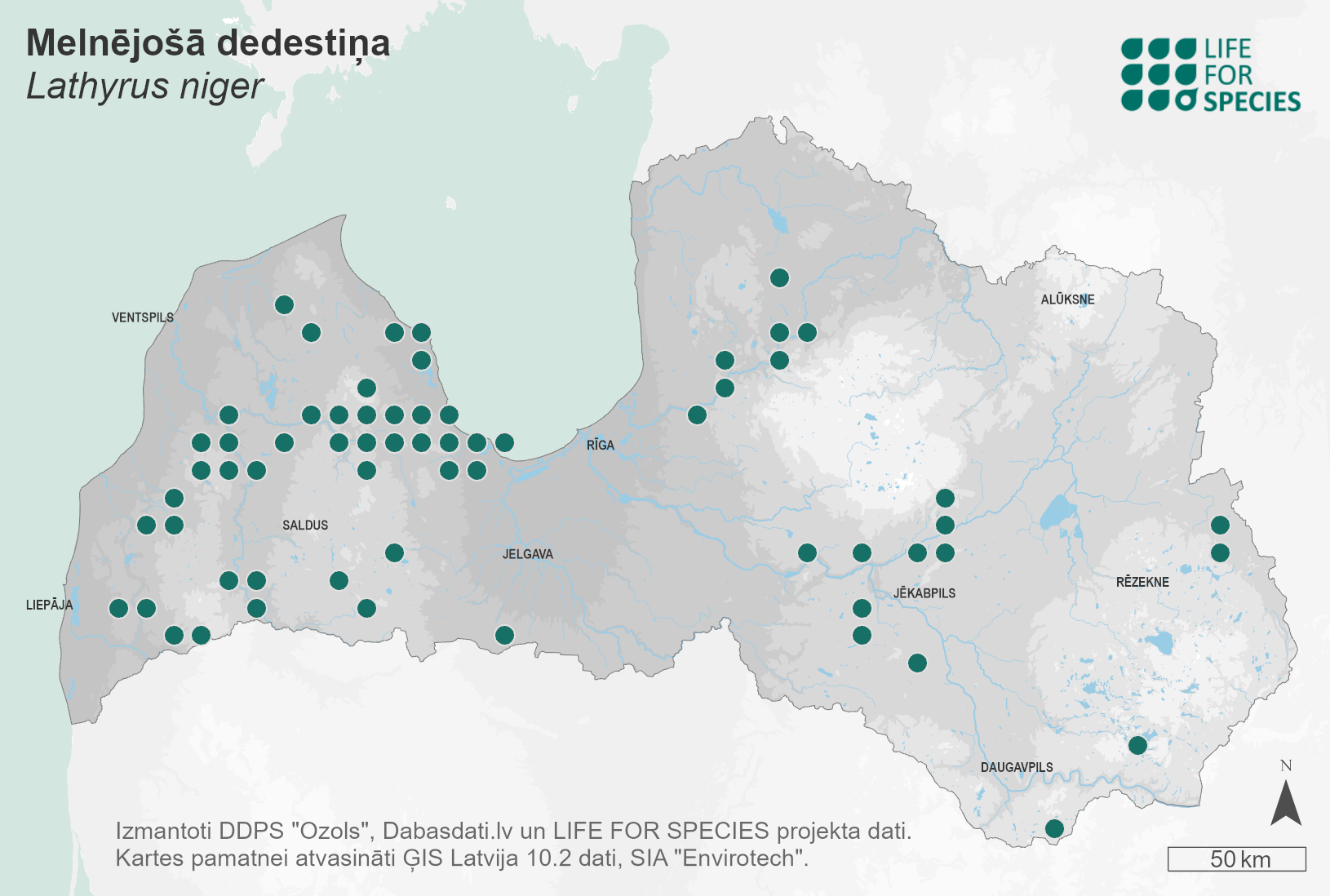 Summary. Black pea – Lathyrus niger. It is relatively rare in Latvia, mainly found in the western part of the country. The EOO is 52,487 km2, and the AOO – 500 km2. The EOO has changed slightly compared to what was known at the end of the 20th century, as no observations of the species have been recorded in south-western and north-eastern Latvia after 1991. However, since no targeted survey of the species’ earlier recorded localities has been carried out, it cannot be undoubtedly assumed that the species is extinct from these places. The population size is unknown. Most often, several dozen individuals are recorded per site, though large groups are rare. The population in Latvia is highly fragmented, and the number of individuals at the sites is decreasing. The species has been found mainly in moderately nutrient-rich pine forests, broadleaf, especially oak, forests, forest edges, along forest roads and in forest glades. The main threats to the species are forestry operations, especially clearcutting and following reforestation with spruce monocultures in places that had been pine or broadleaf forests. Approximately 50% of localities occur in protected areas, e.g., the Gauja and Ķemeri National Parks, the “Engures ezers” and “Abavas senleja” Nature Parks. Logging in the species’ habitats, as well as reforestation with spruce in places where there was previously a pine or broadleaf forest, should not be permitted. An inventory of the earlier recorded localities and new potential localities must be conducted, and the population size must be determined.