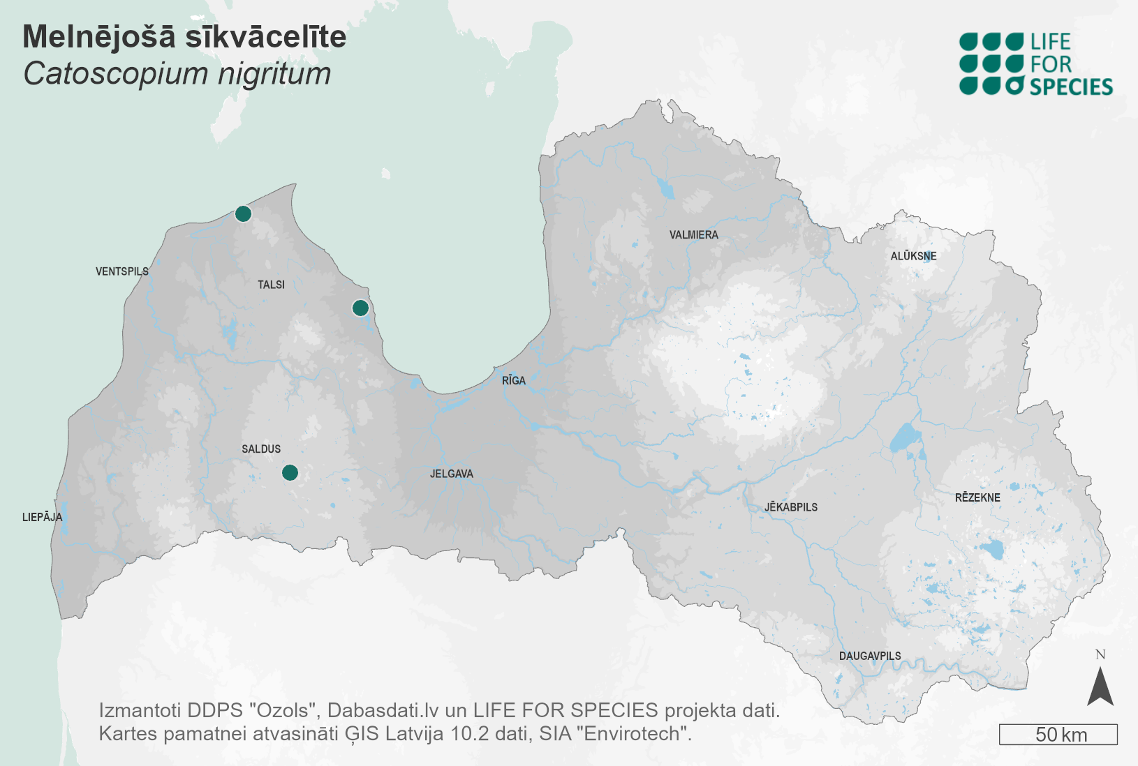 Summary. Down-looking moss – Catoscopium nigritum. The moss is common in the boreal and Arctic regions. It was first found in Latvia by J. Mikutowicz in 1902. Four localities are known today in Kurzeme. AOO is 16 km², and EOO is 2,540 km². There are insufficient data on the size and changes of the regional population in Latvia. It grows in calcareous grass fens, as well as in transition mires on open peat and in bog pools. The species is threatened by habitat drainage, natural succession, peat extraction, drought and declining rainfall. It is assessed as Endangered (EN) due to its small EOO and small and fragmented AOO, with a predicted continued decline in habitat area and quality. A protected species in Latvia. The legal status of the species must be maintained. Although the present-day localities are in protected nature territories (the “Baltezera purvs” Nature Reserve, the Slītere National Park and the “Engures ezers” Nature Park), this does not protect the species from negative impacts. Studies should be carried out on the species’ population size, distribution and dynamics.