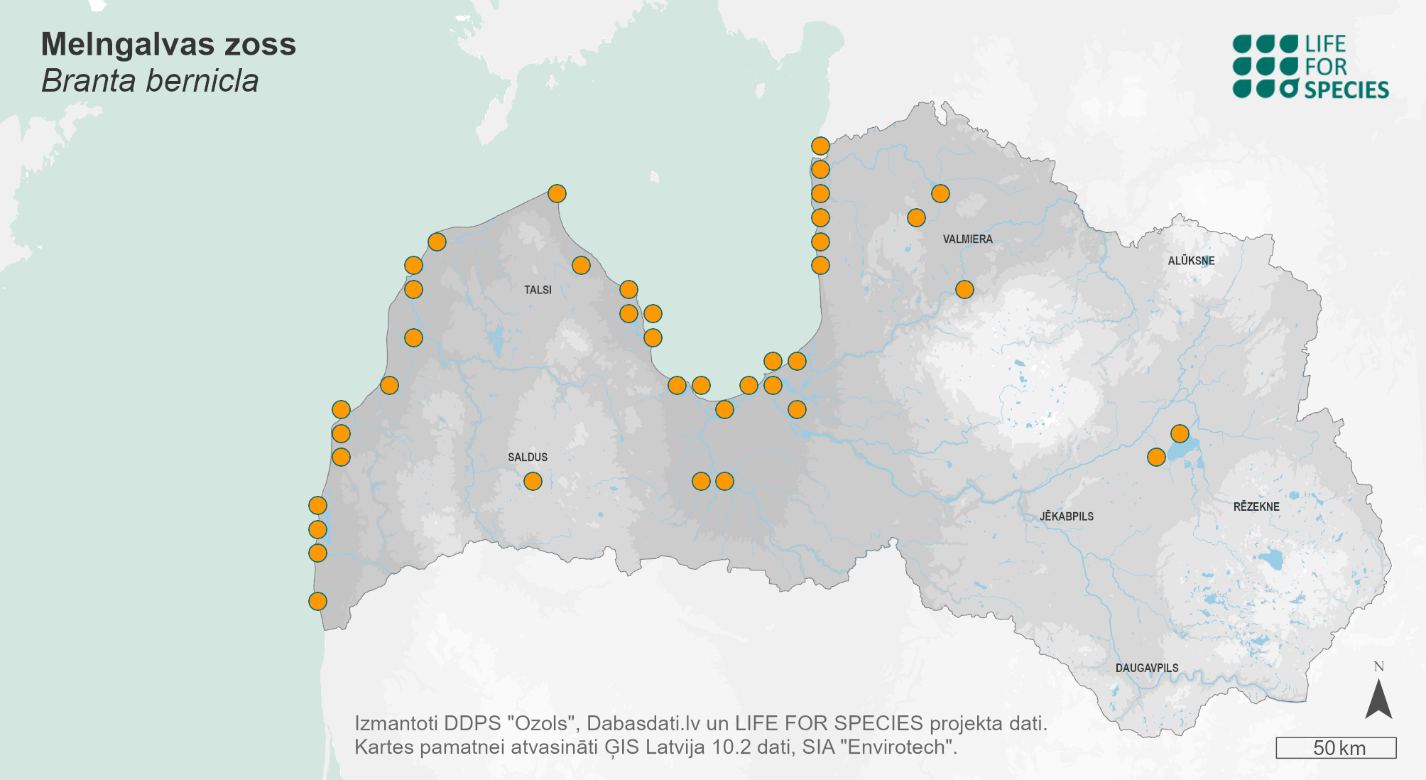 Summary. Brent Goose − Branta bernicla. The AOO of the population migrating through Latvia is 240 km2, the EOO – 43,209 km2. The size of the population migrating through Latvia is unknown, but it is suspected to be less than 1,000 adult individuals. The population trend is also unknown. The species can be found in the sea during migration. At wintering sites, the species may be threatened by farmers if it forages on coastal farmland. The species is susceptible to avian influenza and may be vulnerable to future outbreaks of this disease. The legal status of the species does not need to be changed in Latvia.