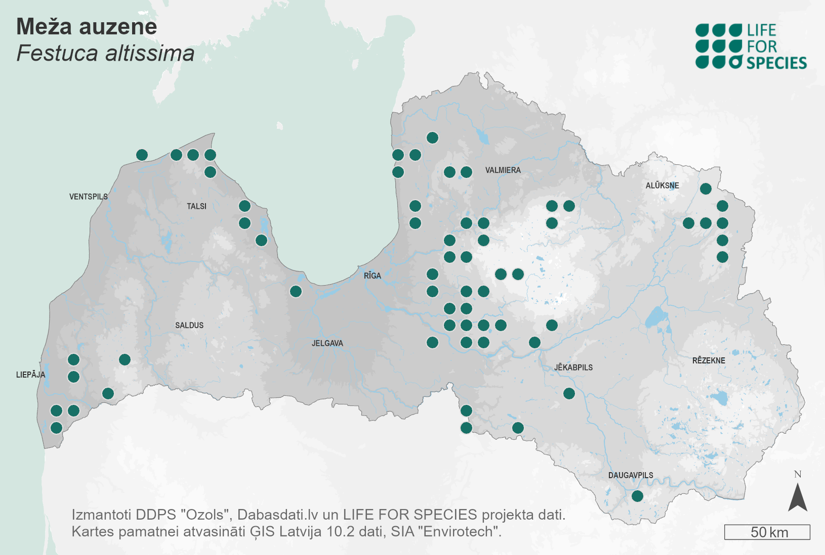 Summary. Wood fescue – Festuca altissima. It is rather rare in Latvia with an uneven distribution. The EOO is 62,961 km2, and the AOO – 568 km2. The distribution of the species has slightly increased compared to what was previously known, but this can be explained by the more intensive floristic research. There are no data on the population size and its dynamics in Latvia. F. altissima is found in Latvia mainly in old-growth natural broadleaf forests or mixed broadleaf-spruce forests, in slightly moist shady places, where it grows as single plants or in small groups. The species is mainly threatened by intensive logging, in some places it may also be affected by drainage, a lack of minor topsoil disturbance or it can be outcompeted in the course of natural succession. The percentage of the species’ localities in protected areas and microreserves is unknown. Significant localities are in the “Aizkraukles purvs un meži”, “Kaļķupes ieleja” and “Vjadas meži” Nature Reserves, and in the Slītere National Park. Studies of the distribution and population size of the species are needed. It is necessary to determine the most important places for conservation. Drainage and logging should not be permitted in the species’ habitats.