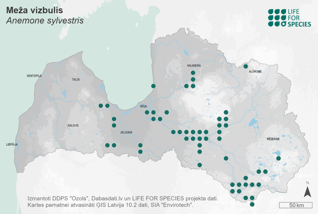 Summary. Snowdrop windflower – Anemone sylvestris. It is not common in Latvia, mainly found in the central and eastern parts, especially along the River Daugava. The AOO is 400 km2, and the EOO – 34,862 km2. The EOO, compared to what was known at the end of the 20th century, has changed slightly. There have been no recorded observations of the species in several localities in western Latvia since 1991. However, since a targeted survey of all the species’ sites has not been carried out, it cannot be stated that the species is extinct there. Studies on the distribution changes and population size have not been conducted. The species grows mainly in sparse dry pine forests and forest edges on carbonate-rich soils, dry calcareous grasslands and dolomite outcrops. In places suitable for growth, it may grow in large groups. The threats are the degradation and loss of semi-natural grasslands due to the cessation of management, a change in land use. Plants are sometimes dug up and planted in gardens or collected during flowering. The percentage of the species’ localities in protected areas is unknown. The species has been found in several protected areas: e.g., the Gauja National Park, the Krustkalni and Teiči Strict Nature Reserves, the “Abavas senleja”, “Cirīša ezers”, “Silene”, “Tērvete”, “Daugavas loki” and “Daugavas ieleja” Nature Parks. The population size, distribution, and threats should be clarified. The conservation of suitable habitats should be ensured by an appropriate protection regime and management. It is recommended to include the species on the list of protected species in Latvia.