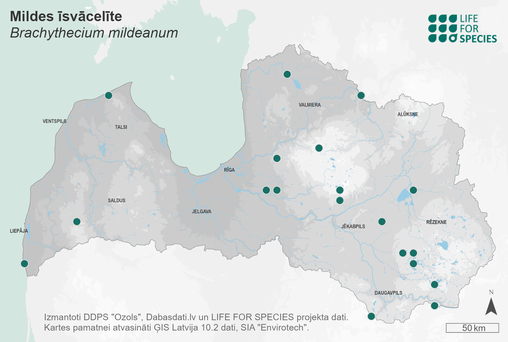 Summary. Sand feather-moss – Brachythecium mildeanum. In Europe, the moss species ranges from the Mediterranean to the Scandinavian Peninsula and from the Atlantic coast to the Ural Mountains. Outside Europe, the species is found in the northern hemisphere in Asia and North America, and rarely in tropical Africa. It was first found in Latvia by E. Zickendraht in 1895. It has been detected in 21 localities in the last 50 years. EOO is 64,289 km2, and AOO is 84 km2. The regional population size and trends in Latvia are unknown. The species grows in fens, wet meadows, and springs on sandy or clayey soil along the banks of water bodies. Due to unclear AOO and threats, assessed as Data Deficient (DD). No particular threat has been identified, as the species has occasionally been found in ruderal areas. Given the species’ association with wet habitats, disturbance of the hydrological regime could have potentially negative effects. The species is not included on the list of protected species of Latvia. It does not require legal protection status. The species has been found in several protected areas, e. g., the Teiči Strict Nature Reserve, the “Kāla ezera salas” and “Lubāna mitrājs” Nature Reserves. Protection of the localities and habitats of the species should be ensured, and studies on the population size, distribution and trends should be carried out.