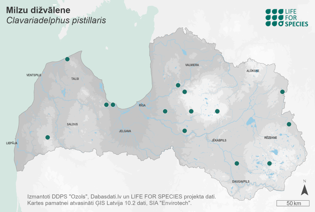 Summary. Giant club – Clavariadelphus pistillaris. Found in Europe, North America, and Asia, but rare in Latvia with 20 localities discovered in various regions by 2022. EOO 60,806 km2, and AOO 80 km2. No information is available on changes in distribution due to a lack of research. Data on the regional population size and changes are lacking. The number of mature individuals probably does not exceed 250. It is a litter and soil saprotroph, also mycorrhizal, mainly with oak and aspen. Common in Europe – in beech forests. In Latvia, it occurs in small groups on soil in deciduous and mixed forests. The species is mainly affected by logging, as well as by the reduction in the proportion of old-growth forests. It is assessed as Vulnerable (VU) due to a very small regional population. It is a protected species in Latvia. The legal conservation status of the species in Latvia may be reviewed, and it is possible that no further protection is necessary. The species is found in protected nature areas such as the Gauja and Slītere National Parks, and the Lielie Kangari and “Aizkraukles purvs un meži” Nature Reserves. The conservation measures are mainly related to the preservation of suitable habitats – deciduous forests. Further studies are needed on the species’ occurrence, ecology and threats.