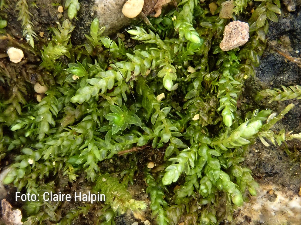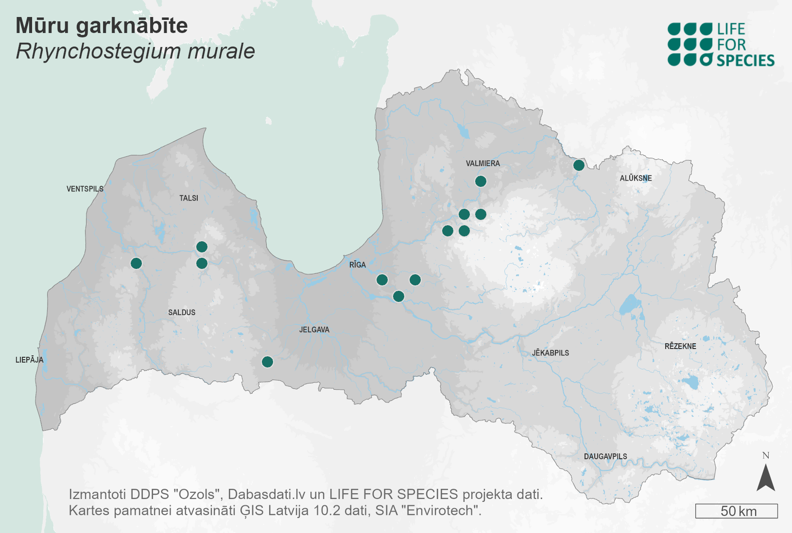 Summary. Wall feather-moss – Rhynchostegium murale. In Europe, the moss is found from the Scandinavian Peninsula to the Mediterranean, and is widespread in Central Europe. It was first found in Latvia by C. Heugel in 1847. In total, data are available for 8 historical and 14 current localities, primarily located in the Vidzeme and Kurzeme regions. EOO has increased from 7,241 km2 to 11,855 km2, while AOO has increased from 32 km2 to 56 km2. In Latvia, no quantitative studies have been carried out on the regional population and its changes. Overall, the population status of the species cannot be said to have improved. The species grows on rocks of various compositions (often dolomites, limestones, less often granites) in open to moderately shaded conditions. More common in wet areas, washed by rivers, streams; less common in dry areas. There are no major threats to this species at the European level. It is assessed as Near Threatened (NT) as subpopulations are currently stable, but the situation may change if more localities are destroyed and the area occupied by the species declines. A protected species in Latvia. The legal status of the species must be maintained. 65% of the present-day localities of the species are in protected nature territories – the “Ventas ieleja”, “Skujaines un Svētaines ieleja” Nature Reserves, the Gauja National Park, the “Abavas senleja” Nature Park, the “Kalamecu and Markuzu gravas” protected geological and geomorphological nature monument, and the “Ziemeļgauja” Protected Landscape Area. Protection of the localities and habitats of the species should be ensured, and studies on the population size, distribution and trends should be carried out.