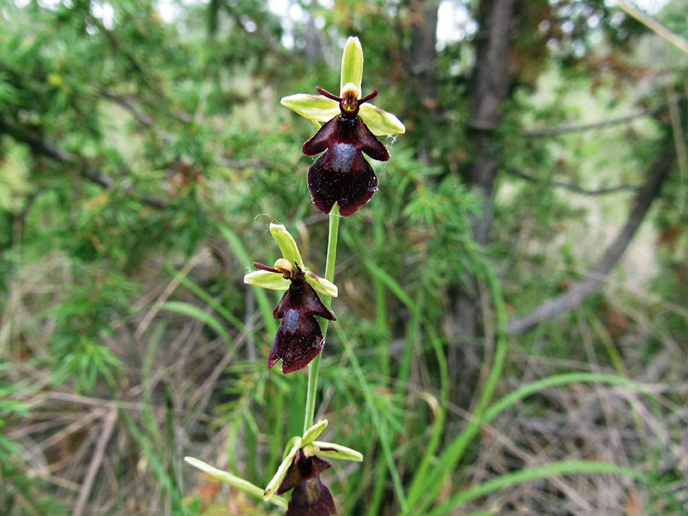 Summary. Fly orchid – Ophrys insectifera. It is very rare and known only from three places in western Latvia. In 2025, a new locality was found in the Slītere National park. In the past, the species was also found in Kandava and near Lake Zebrus, but there are no recent observations of O. insectifera in these places. The EOO is 7,757 km2, and the AOO – 48 km2. There are fewer than 2,500 individuals in the Latvian population. The largest number of individuals (could be 80–90%) occurs in the “Engures ezers” Nature Park, and the smallest in the “Tosmare” Nature Reserve, where only one flowering plant of low vitality was found in 2023. The population and its dynamics have not been studied. O. insectifera grows in alkaline fens, calcareous grasslands on soils with fluctuating water tables, and sparse, periodically wet pine forests on calcareous soils. The main threats are cessation of grassland and fen management and drainage. The plants are sometimes dug up by wild boars. All O. insectifera localities occur in protected areas. Studies of the species’ population dynamics, pollinator populations, as well as studies on the effect of different management measures are necessary. The earlier recorded localities, including Tosmare, must be re-visited and the sizes of subpopulations assessed.