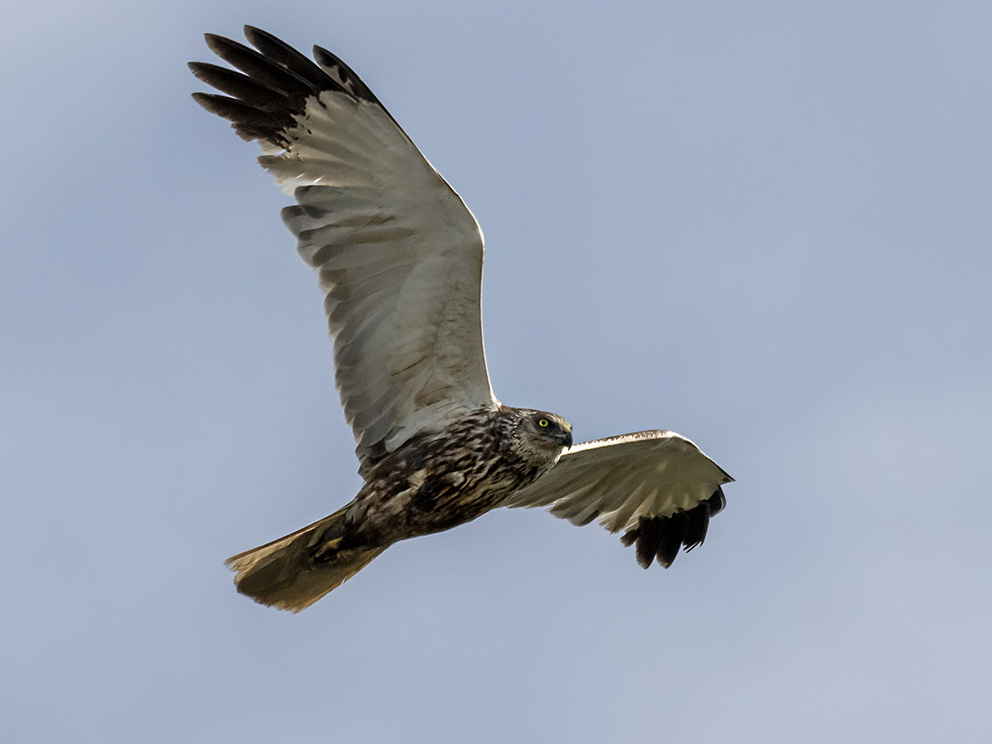 Summary. Western Marsh-harrier − Circus aeruginosus. In Latvia, the distribution increased between 1980–1984 and 2000–2004, while no considerable change in distribution occurred between 2000–2004 and 2013–2017. The AOO of breeding population is 1,940 km2, the EOO – 79,797 km2. The breeding population is estimated at 7,715–22,056 females (15,430–44,112 adult individuals). The long-term population trend is unknown, while the short-term trend – unclear. However, a 34% drop in population is projected if the current population change is extrapolated over three generations. The breeding habitat includes water bodies overgrown with reeds – lakes, ponds, quarries, beaver ponds, and similar sites, as well as wetlands with denser reed stands or grasslands overgrown with reeds. They also forage in open countryside and wetlands. Drainage and desiccation of wetlands, persecution, pollution (especially due to pesticide use in and near wetlands), heavy metal poisoning (especially from lead shot, as it forages on waterfowl) pose significant threats to the species. Birds are often killed illegally. The species may also be threatened by the development of wind farms. Monitoring of the breeding population of the species is ongoing. The legal status of protected species needs to be maintained in Latvia. Conservation of reedbeds is essential for the protection of the species.