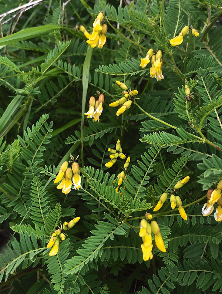 Morfoloģija un bioloģija. Daudzgadīgs 30–50 (60) cm augsts lakstaugs. Stublājs stāvs vai pacils, spēcīgs, zarots, ar matiņiem. Lapas 5–10 cm garas, nepāra plūksnaini saliktas no 7–15 pāriem eliptisku lapiņu. Pielapes 7–10 mm garas. Ziedi lapu žāklēs garkātainos, blīvos, 2–4 cm garos ķekaros stublāja un zaru galā, parasti ķekarā 4–14 ziedi. Tie ir nokareni, ap 1 cm gari, kauss zvanveidīgs, klāts ar tumšbrūniem matiņiem, vainags tumšdzeltens. Auglis – pāksts, 2–3 cm gara, nokarena, uzpūsta, klāta ar melniem matiņiem. Zied jūnijā un jūlijā (Kabucis 2003; Roze 2015).