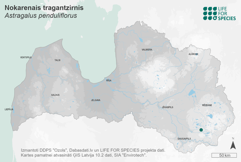 Summary. Mountain lentil – Astragalus penduliflorus. A very rare species in Latvia, with only one known locality. Both the AOO and the EOO are 4 km2. In the only site in Latvia, in the Krāslava region, the species forms a small but stable population, known since 1967. This population has had 25–30 flowering individuals for a long time. When surveying the site in 2023, it was found that the site was partially destroyed by gravel extraction. Recently, only one flower and four non-flowering individuals were there. Until 2003, when the species was included in the Latvian Red Data Book, it was considered an anthropophyte. Currently, the species is considered native and the site is included in the species’ distribution range, as the habitat is natural, the same as in Sweden. In Latvia, A. penduliflorus grows in dry pine forest and on forest edge. The species is threatened by gravel extraction, forestry. The increased shading caused by overgrowing dry pine forests due to natural succession and eutrophication is considered a threat. The current protection of the species is insufficient; the only site is located outside protected areas without any restrictions. It is necessary to ensure a protection status of the site or otherwise ensure the conservation of the species and its habitat. A survey of potential habitats in the vicinity of the species’ locality is necessary. The species should be propagated ex situ, and the population in situ should be supplemented with individuals to support the population in the wild. The site should be monitored.