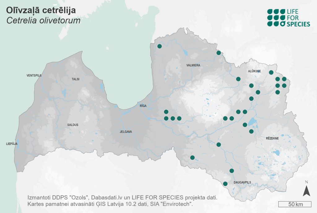 Summary. Cetrelia olivetorum is found in Europe, Asia, North America and Australia. Approximately 35 localities are known in Latvia. The EOO is 24,707 km2, and the AOO is 148 km2. This epiphytic species grows on the bark of black alder (and less often on other broadleaf trees) in old, natural broadleaf forests with stable to high air humidity. In Latvia, it has also been found on ash, linden, oak, aspen, hazel, white alder and birch. The species is threatened by logging, which not only reduces the number of suitable trees but also alters the forest microclimate, as well as by forest drainage. It is assessed as Vulnerable (VU) because the number of mature individuals does not exceed 1,000. It is a protected species in Latvia, and micro-reserves can be created for the preservation of its habitats. Its legal status of protection must be maintained. The species has been found in protected areas, for example, in the “Vecumu meži” Nature Park; however, most of the localities are outside the protected areas. The species’ localities should be protected by preventing logging and other activities that alter the natural microclimate.