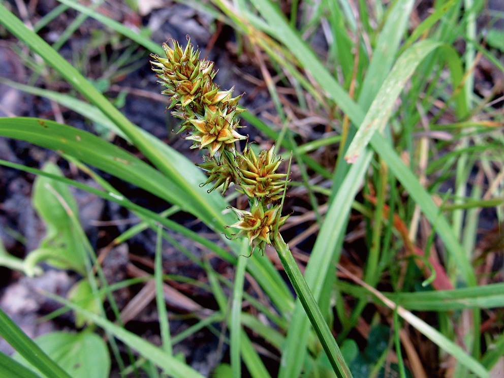 Summary. False fox-sedge – Carex otrubae. It is rare in Latvia, found mainly in the Coastal Lowland, near the south-western coast of the Gulf of Riga, with isolated localities in the western and central parts of the country. The EOO is 7,111 km2; the distribution of the species has decreased compared to what was previously known. The AOO is 72 km2. There is no data on the size of subpopulations in each locality and the overall population dynamics in Latvia. The species can form small groups, but usually, the number of individuals per site does not exceed a few dozen. C. otrubae grows in mesic to wet grasslands, abandoned dolomite quarries, roadsides, ditches, on moist, moderately rich, alkaline soil. The species is threatened by the drainage of moist and wet grasslands and the cessation of semi-natural grassland management. The percentage of the population occurring in protected areas is unknown. The largest subpopulations are known from the Ķemeri National Park. Research on the distribution and population size is required. It is recommended to identify places with the largest number of individuals of the species and to ensure their conservation. Restoration and maintenance of suitable habitats in semi-natural grasslands and similar habitats are required. The species should be included on the list of protected species in Latvia.