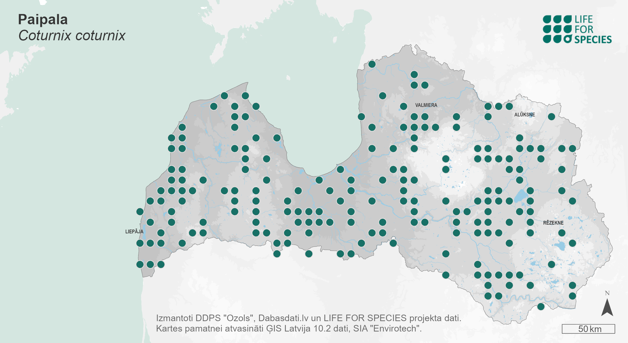 Summary. Common Quail − Coturnix coturnix. In Latvia, the distribution increased between 1980–1984 and 2000–2004, and decreased between 2000–2004 and 2013–2017, but due to the species-specific population fluctuations, it is not clear if the differences in distribution are indicative of population trends. The AOO of the breeding population is 1,164 km², the EOO – 73,878 km². The breeding population is estimated at 540–1,000 males (1,080–2,000 adult individuals). The population fluctuates without a clear trend, however, there is a high probability that the population has declined by more than 30% over three generations. The species inhabits cultivated grasslands, perennial grasslands, clover or cereal fields, and similar cultivated landscapes. The species is threatened by increasing agricultural intensity and the use of herbicides and insecticides, which reduce food availability. The legal status of protected species needs to be maintained in Latvia.