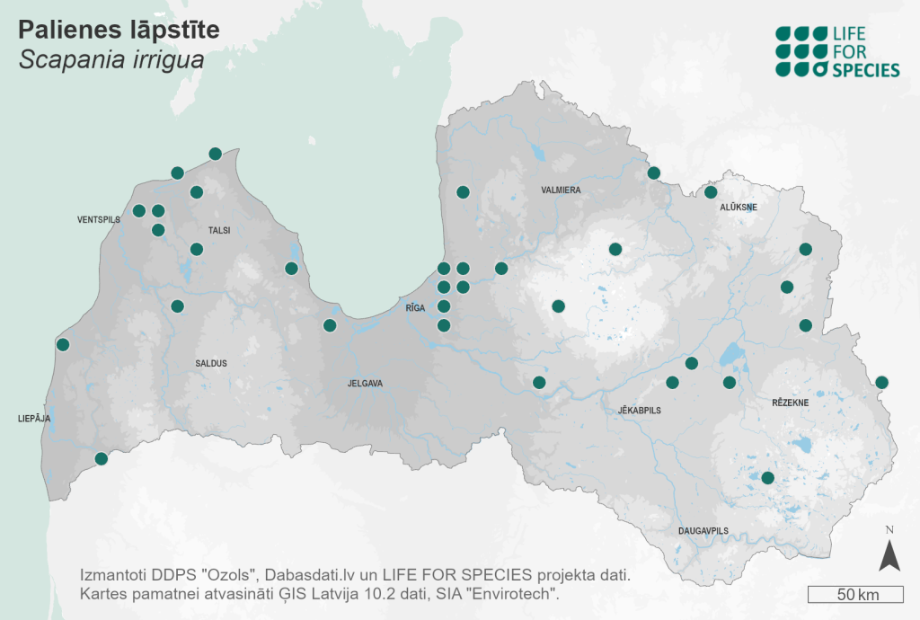 Summary. Heath earwort – Scapania irrigua. The liverwort is found in almost all European countries, including Iceland. It is also common in the Asian part of Russia, also in Japan, and is widespread in North America, including Greenland. It was first found in Latvia by G. Girgensohn in 1853. In the last 40 years, it has been found in about 50 localities scattered throughout Latvia, except Zemgale. EOO is 57,708 km2, and AOO is 176 km2. In Latvia, the size and trends of its regional population is unknown, but in general it is assessed as stable. In Latvia, it grows in transition mires and fens, swamps and alluvial forests, along water edges on soil and decaying wood, occasionally along paths and on stones. Potential threats to the species include drought and a decrease in precipitation due to climate change. Considering the existing threats and the slight decrease in the AOO, it is assessed as Near Threatened (NT). The species should be included on the list of protected species of Latvia. The species can be found in several protected areas. Protection of the localities and habitats of the species should be ensured, expert training and studies on the population size, distribution and dynamics and habitat trends should be carried out.
