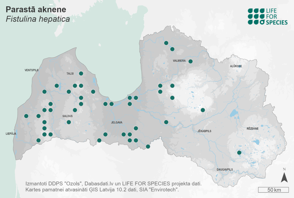 Summary. Beefsteak fungus – Fistulina hepatica. Found in Europe, America, Australia, Africa, and East Asia. More than 60 localities are known in Latvia in different regions. The EOO is 38,600 km2, and the AOO – 244 km2. There are no sufficient data on the size of the regional population and its changes. The estimated number of mature individuals is about 800. The regional population is most likely declining and will continue to decline due to the reduction in the area of suitable habitat (deciduous forests), and the number of large oaks. It is a wood saprotroph, causing brown rot, which develops very slowly, forming cavities. The species grows on the trunks of large oaks, usually in the lower part of the trunk and can be found in broadleaved forests, on the slopes of river ravines, also in parks, alleys, wooded meadows, and on solitary trees. In Latvia, the species is threatened both by forestry activities, which reduce the area of broadleaved forests, and by a reduction in the number of old trees in such forests. Another threat is landscape change as a result of economic activity. It is assessed as Vulnerable (VU) due to its small regional population. A protected species in Latvia – its legal status needs to be maintained. About half of the regional population is found in protected nature areas such as the Gauja and Ķemeri National Parks, the “Abavas senleja” Nature Park, and the “Dunalkas meži” and “Tebras ozolu meži” Nature Reserves. Part of it grows on noble trees of national or local importance. The conservation measures are mainly related to the preservation of suitable habitats and large, old oaks, which are often affected by decay, as well as the presence of oaks of different ages in the landscape. Research is needed on the distribution, ecology and threats to the species.