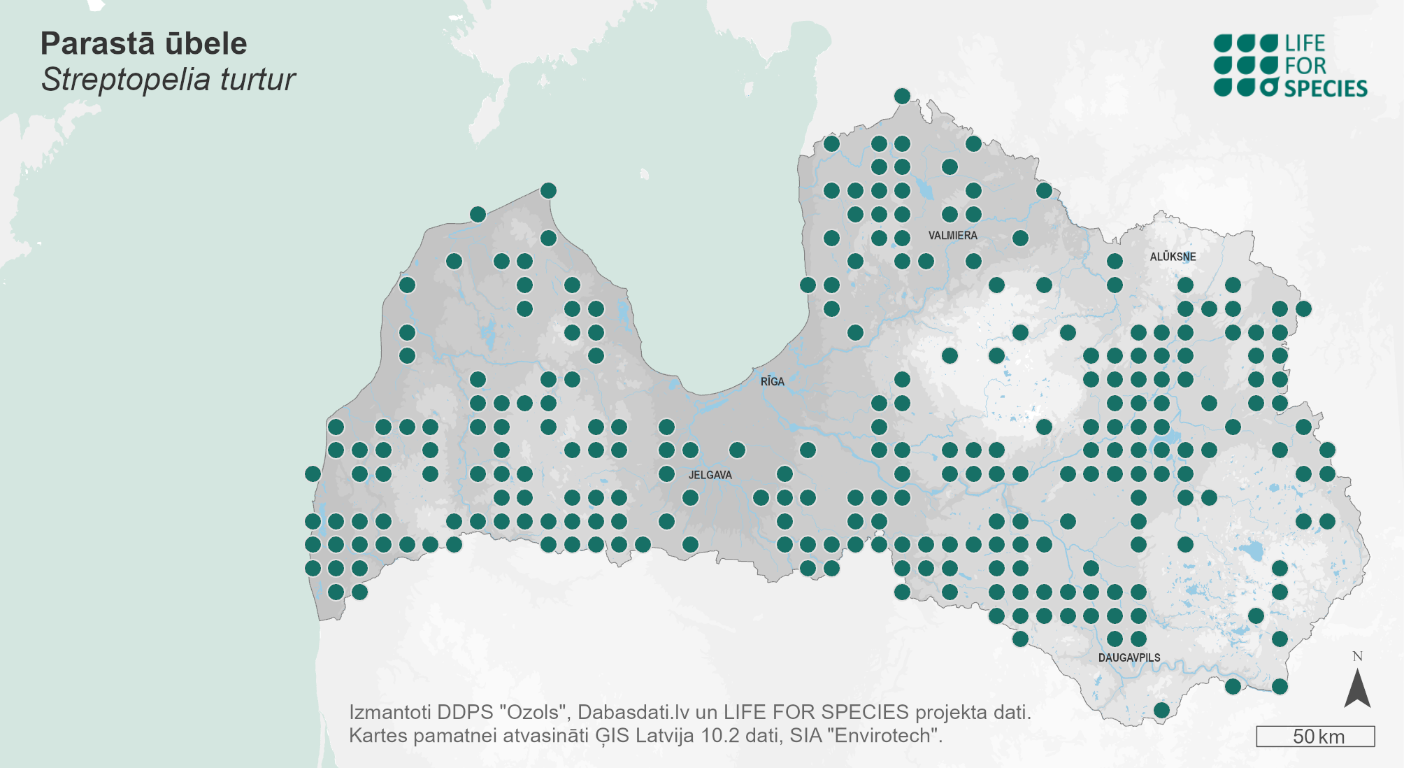 Summary. European Turtle-dove − Streptopelia turtur. In Latvia, the distribution declined between 1980–1984 and 2000– 2004; the decline continued between 2000–2004 and 2013–2017. The AOO is 2,040 km2, the EOO – 79,908 km2. The breeding population is estimated at 3,579–12,361 pairs (7,158–24,722 adult individuals). The long-term population trend is unclear, while in the short term, the population is declining. Over three generations, the population has declined by 32%. It breeds in small clusters of mixed or deciduous forests next to grasslands and fields, on forest edges and in shrubberies, and it is not uncommon in young spruce stands. Transformation of agricultural land and loss of semi-natural habitats are considered to be important factors in the population decline of the species. Changes in agriculture can reduce the availability of food, as well as breeding sites, and the scarcity of food is likely to play a greater role. The widespread use of herbicides has reduced the abundance of forage plants. The species is negatively affected by both hunting and illegal killing. Mortality is also caused by the parasite Trichomonas gallinae. Drought in the Sahel may have also contributed to the decline of the species. The species needs to be included on the list of protected species of Latvia. The maintenance of grasslands and field edges (without the use of herbicides) near forests is required to protect the species.
