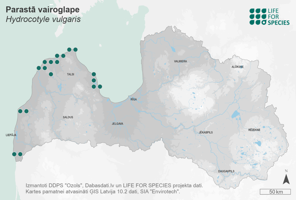 Summary. Marsh pennywort – Hydrocotyle vulgaris. It is rare in Latvia and found mainly in the Coastal Lowland. The EOO is 10,781 km2, and the AOO – 164 km2. The EOO has slightly decreased compared to what was previously known. There are no recent data after 1991 from the vicinity of Riga, Jūrmala, and a locality in central Latvia. However, since no targeted studies have been conducted, the species distribution is probably wider than currently known. There is no data on the size of subpopulations in each locality and the population dynamics. The number of species’ records is slightly more than 100. H. vulgaris forms patches that cover from a few to several dozen square meters. In Latvia, the species has been found in moist to moderately moist grasslands, fens, reed and sedge communities in the littoral zone of lakes, in black alder swamps and wet beaches. H. vulgaris is mainly threatened by drainage of mires, forests and grasslands, cessation of grassland management, and conversion of grasslands into arable land. Most of the known localities are in protected areas. It is recommended to specify the population size in Latvia and determine the most important places for the conservation of H. vulgaris population. Drainage of H. vulgaris habitats should not be permitted.