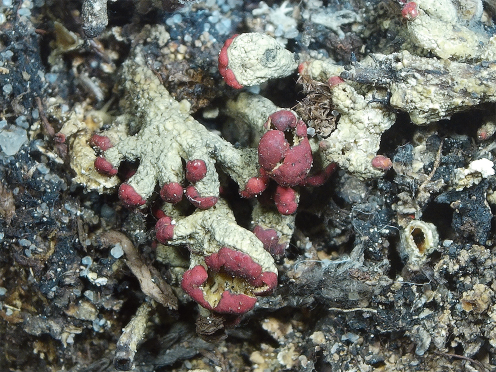 Morfoloģija un bioloģija. Paresninātās kladonijas primārā lapoņa zvīņas ir sīkas, plānas, dzeltenas, apakšpuse nedaudz gaišāka. Sākumā tās pieguļ substrātam, vēlāk pacilus ciešās velēniņās. Zvīņas ir ar sorēdijām vai arī pilnīgi sadalījušās dzeltenā miltainu sorēdiju masā. Podēciji sīki, 2–5 mm gari, 0,5–1,0 mm resni, vienkārši vai augšdaļā zaraini. Podēciji ir ar gludu, kārpainu mizas kārtu vai ar sorēdijām bez filoklādijiem. Apotēciji spilgti sarkani, attīstās podēciju galos. Epitēcijs sarkans. Himēnijs iesarkans vai bezkrāsains. Piknīdas tumšbrūnas ar sarkanīgu augšgalu, kārpveida vai olveida, pie pamatnes sašaurinātas, attīstās uz podēcijiem vai primārā lapoņa zvīņām (A. Piterāns, nepubl. materiāli).