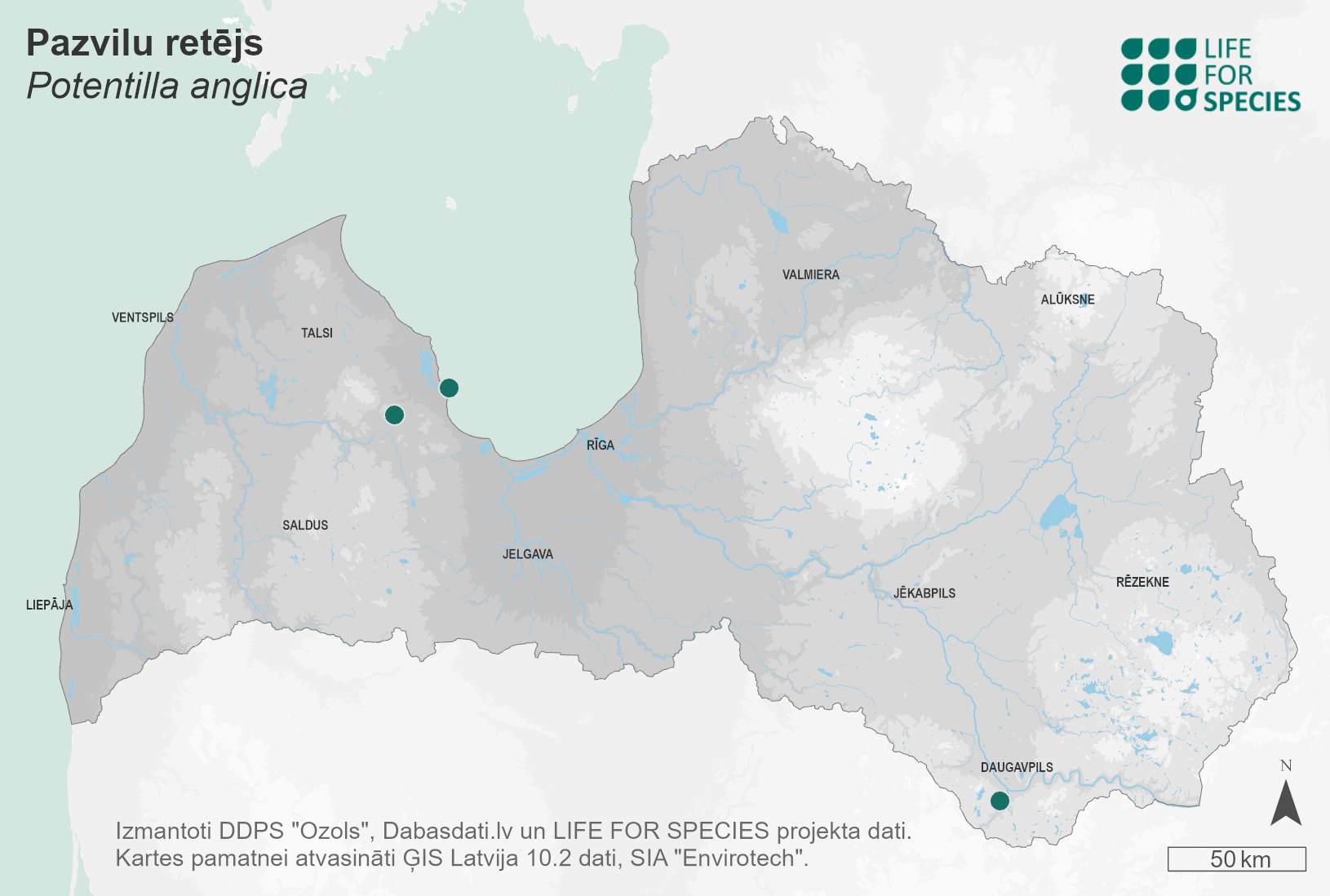 Summary. Trailing tormentil – Potentilla anglica. It is very rare in Latvia, only occurring in the Coastal Lowland. The AOO is 16 km2, and the EOO – 2,228 km2. There are no reliable data on the changes in the AOO and the EOO over the last 30 years. However, it is known that the species has not been found repeatedly in most of the localities recorded earlier during the last 30 years – it has only survived in Bērzciems. A rich locality was found in Daugavpils (2013). Still, the species may be present elsewhere in the distribution range, as there have not been any targeted surveys. P. anglica grows in mesic semi-natural meadows, wet grassland on soils with fluctuating groundwater tables, and dry old fallow, and may be also present in other types of grasslands. The richest known population (Bērzciems) occurs in the “Engures ezers” Nature Park; the other localities are outside protected areas. The main threats are the cessation of semi-natural grassland management leading to overgrowing, as well as intensive forest management. It is necessary to survey the known and potential localities, to specify the population size, distribution dynamics and threats. The preservation of suitable habitats for the species must be ensured by an appropriate protection regime and management (grassland restoration, mowing and grazing).