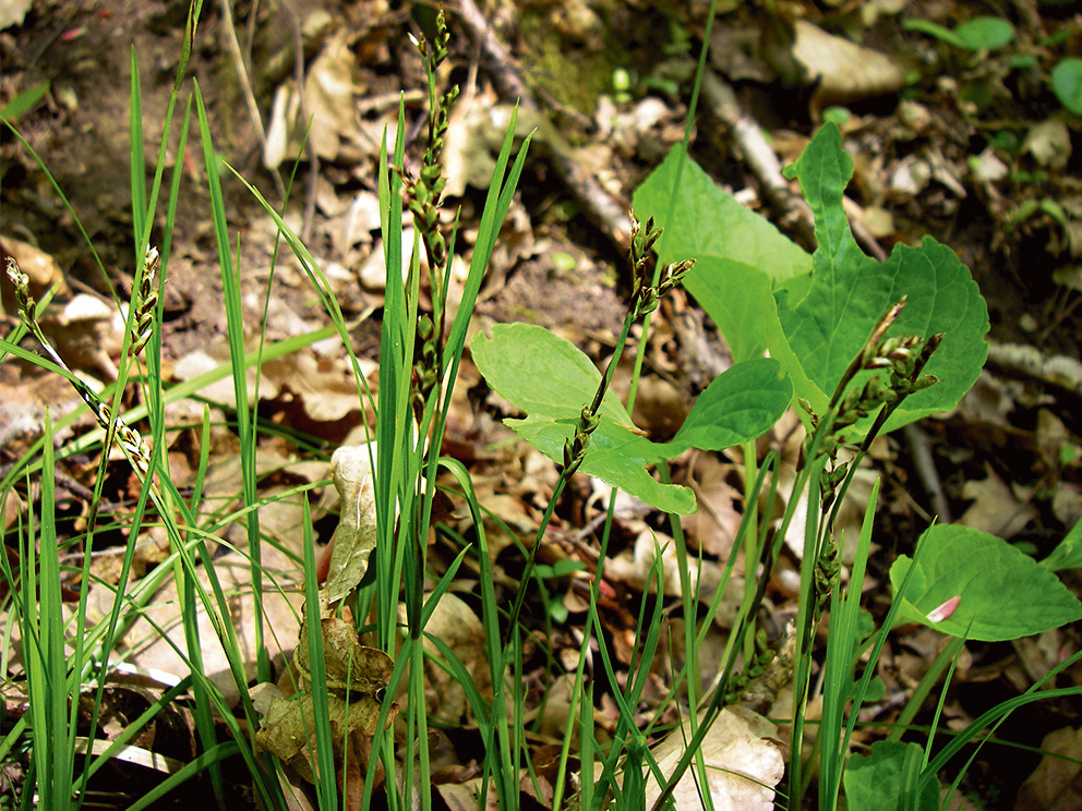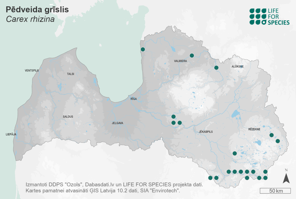 Summary. Carex rhizina is very rare in Latvia and has been recorded in the northern and eastern parts of the country. The EOO is 25,136 km2, and the AOO – 112 km2. Since 1991, the EOO has decreased. There is no more information about the species’ locality near Ķestermuiža (Dobele municipality). However, several new localities have been detected in eastern Latvia. The population size and its dynamics are unknown. The largest subpopulations are known from the vicinity of Krāslava. C. rhizina grows mainly in slope and ravine forests near rivers, and coniferous and broadleaf forests, where it forms sparse groups. The threats are intensive forestry operations, the establishment of forest monocultures and forest road infrastructure. Approximately 80% of the known localities are in protected areas; the “Augšdaugava” Protected Landscape Area is considered the core territory of this species. C. rhizina has also been recorded in the “Ziemeļgauja” Protected Landscape Area, the “Ogres ieleja” Nature Park and the “Raudas meži” Nature Reserve. An assessment of the population size should be carried out. The conservation of suitable habitats, mainly slope and ravine forests, should be ensured through a non-interference regime. It is necessary to establish microreserves or expand the existing protected areas. A more accurate identification of the species’ habitats and ecological requirements is needed, which would help to identify new localities.