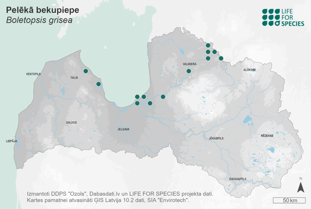 Summary. Grey falsebolete – Boletopsis grisea. Distributed in the Northern Hemisphere of Eurasia, and North America. In Europe, it occurs in the boreal zone, following the range of the Scots pine. It is rare in Latvia, with about 20 known localities. The EOO is 9,873 km2, and the AOO – 84 km2. There are insufficient data on the regional population size and changes. The number of mature individuals is approximately 140. It is mycorrhizal with Scots pine and can grow in the same place for several years or even decades. If the tree with which it forms a mycorrhiza survives, it can survive forest fires. It grows in dry pine forests on sandy soils. In Latvia, it is most common in the coastal forests, and less common inland. The species is most negatively affected by habitat modification – logging in old pine forests. The species rarely, if ever, recovers after clear-cutting and the area of suitable habitat is decreasing. It is assessed as Endangered (EN) due to its very small, fragmented regional population and expected further decline. The species is not included in the EU or Latvian lists of protected species. It is proposed to be included on the list of protected species in Latvia. It is found in protected nature areas, e.g. in the “Buļļu kāpas” Nature Reserve, the “Piejūra” Nature Park and others. Old pine forests on sandy soils should be preserved to protect the species. Research is needed on the distribution, ecology and threats to the species.